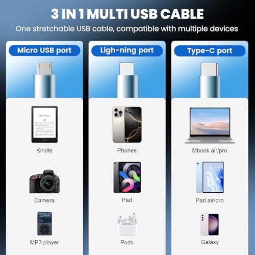 Câble USB 3 en 1 : ce câble de charge rétractable combine des entrées USB-A et USB-C avec trois sorties (type C, micro USB et téléphone), ce qui en fait un câble multi-USB universel pour smartphones, tablettes, ordinateurs portables et plus encore. Le câble de charge USB parfait 3 en 1 permet d’économiser de l’espace et évite les enchevêtrements de câbles – un seul câble pour tous vos appareils.