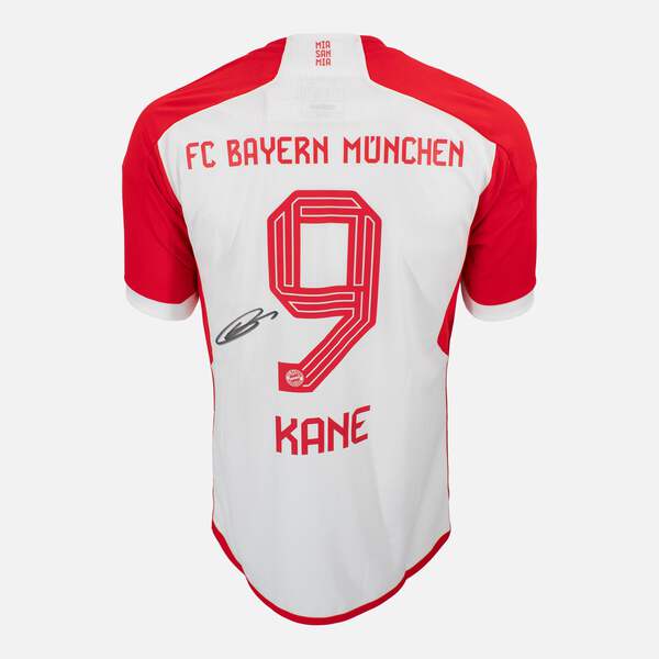 Harry Kane personally signed Bayern Munich, Official Adidas home kit from the 2023-24 season. A record-breaking debut year saw him score 36 Bundesliga goals to win the Torjägerkanone and the European Golden Shoe. He produced multiple league hat-tricks, including a standout treble in Der Klassiker as Bayern won 4-0 away at Dortmund, and his halfway-line strike against Darmstadt was voted Bundesliga Goal of the Season. He also finished joint top scorer in the 2023-24 Champions League with eight goals. A signature that captures an all-time scoring campaign in Munich.