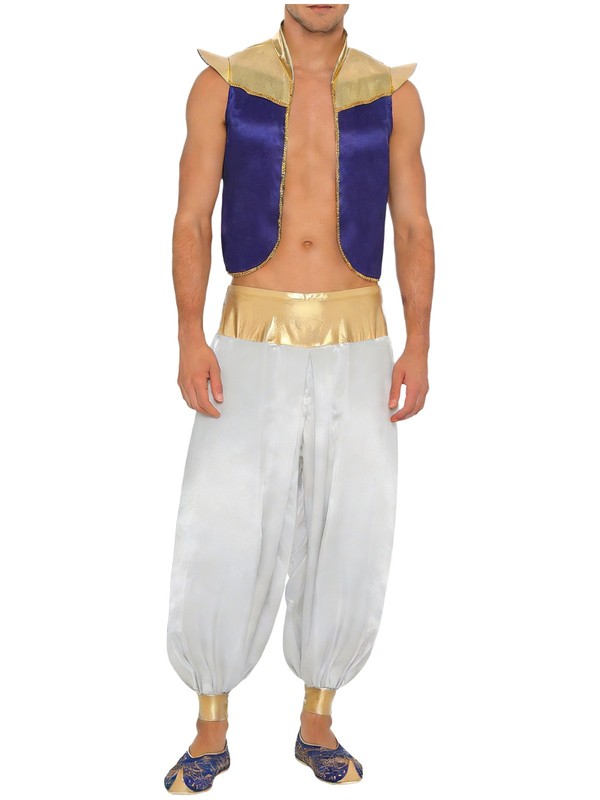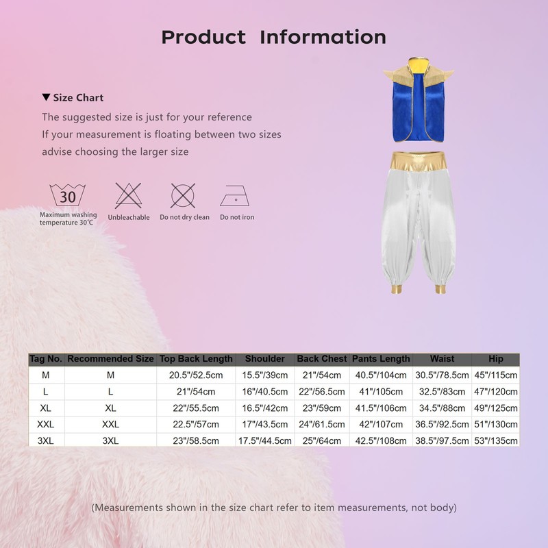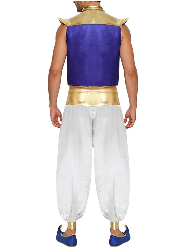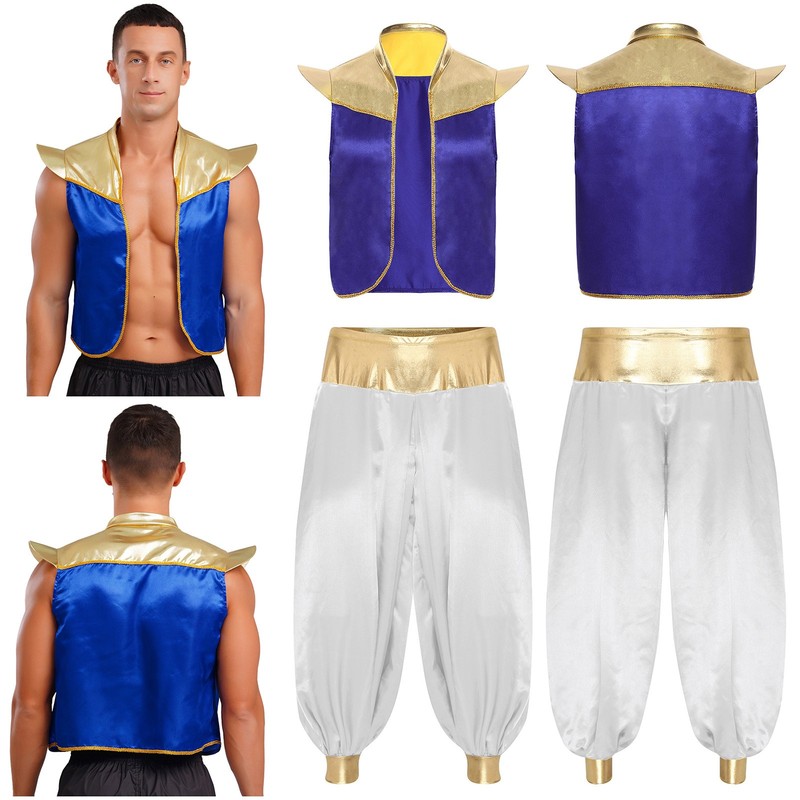 This 2-piece set is perfect for Halloween cosplay, enabling the wearer to transform into an Arab prince or a magical lamp character vividly.