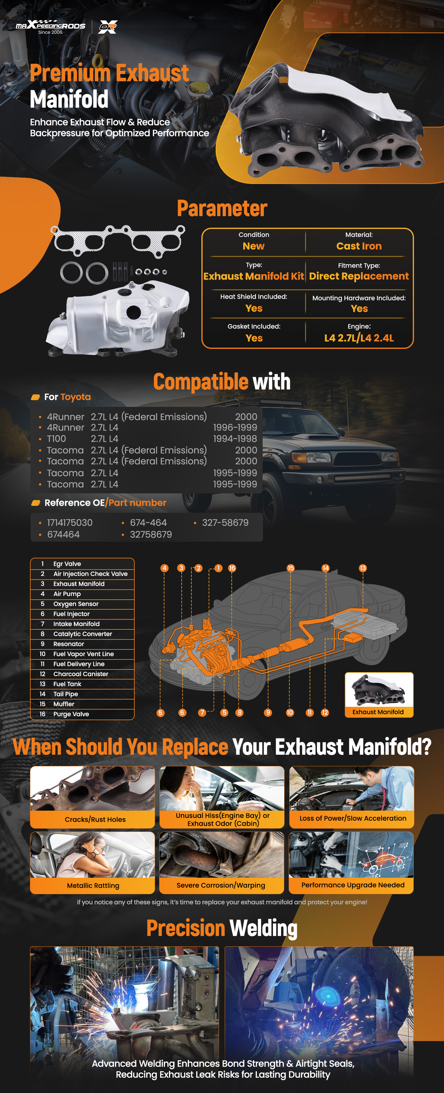 Exhaust Manifold w/Gasket For Toyota 4Runner Tacoma T100 94-00 2.4L 2.7L 674464