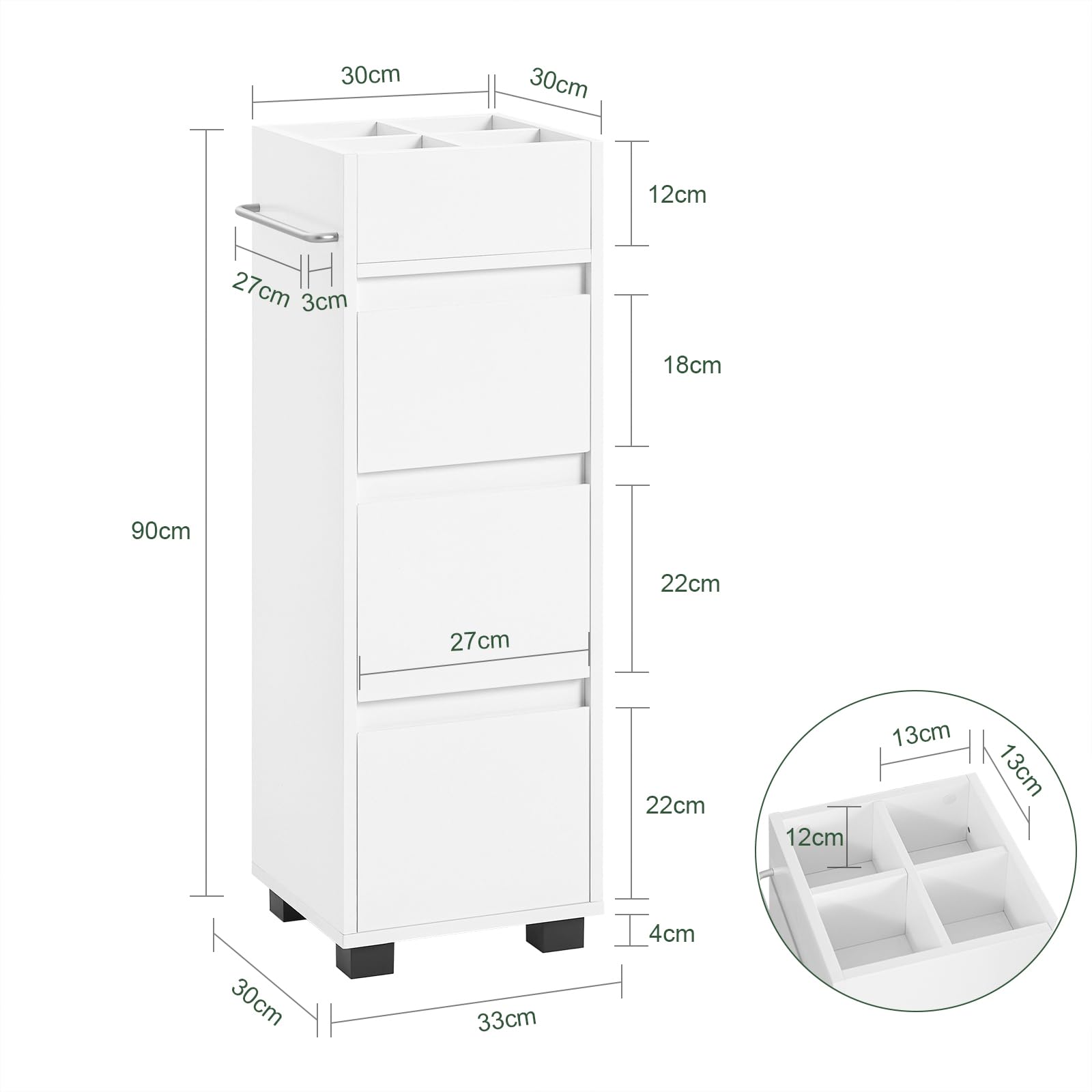 [Massimo Spazio & Design Compatto]: Questo piccolo mobile da bagno offre un ampio spazio con 3 cassetti e 4 ripiani aperti, perfetto per organizzare gli articoli da bagno anche in piccoli spazi o toilette (WC). Dimensioni: 30x90x30 cm | Peso: 15,4 kg