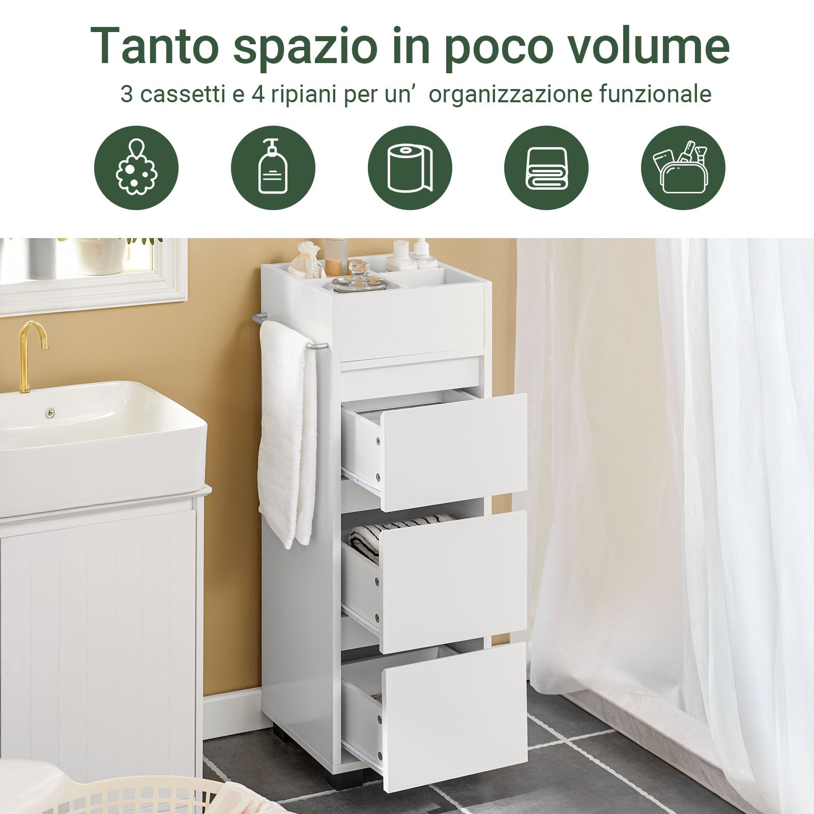 Mobiletto Bagno Salvaspazio Mobile Stretto Bagno 3 Cassetti e 4 Scomparti Bianco
