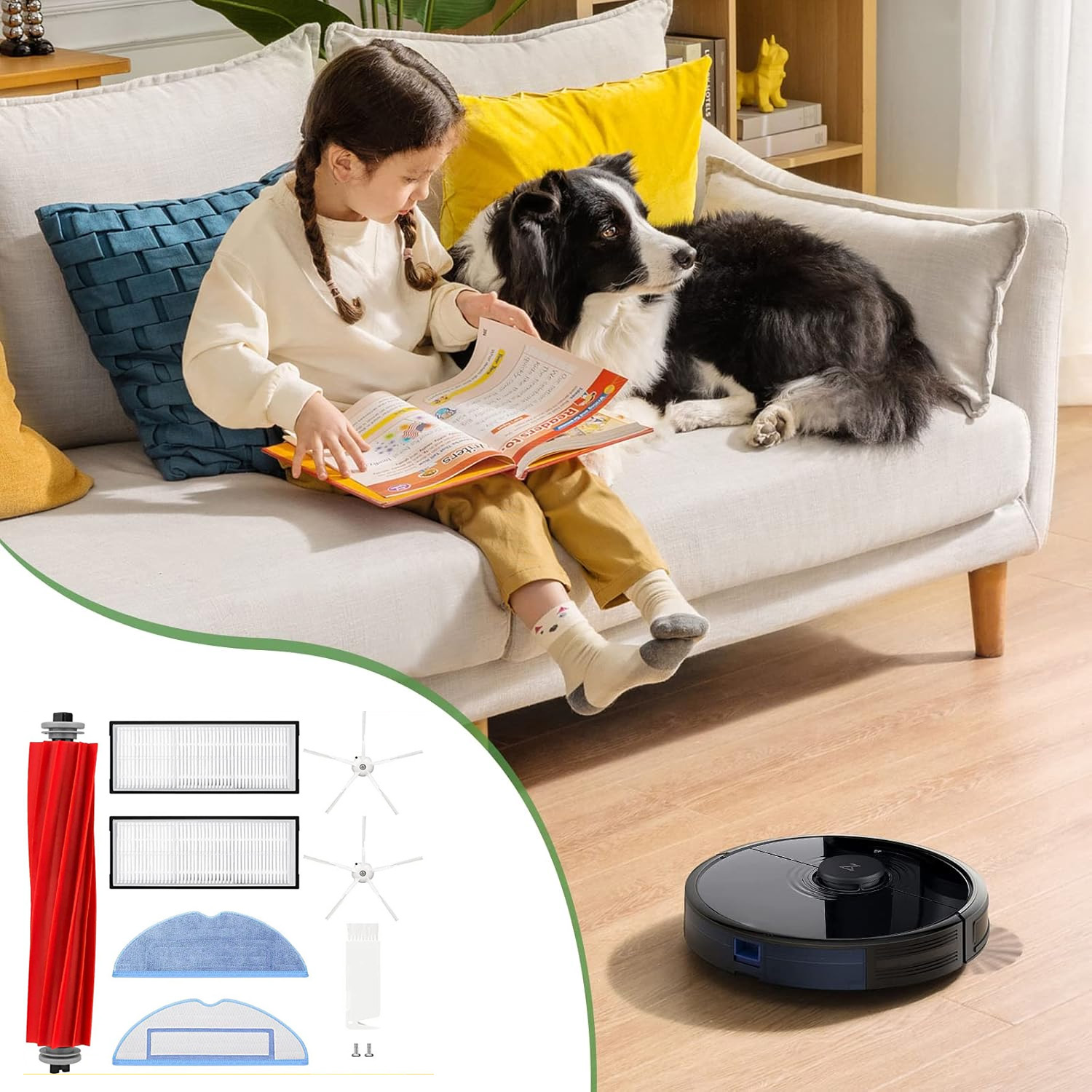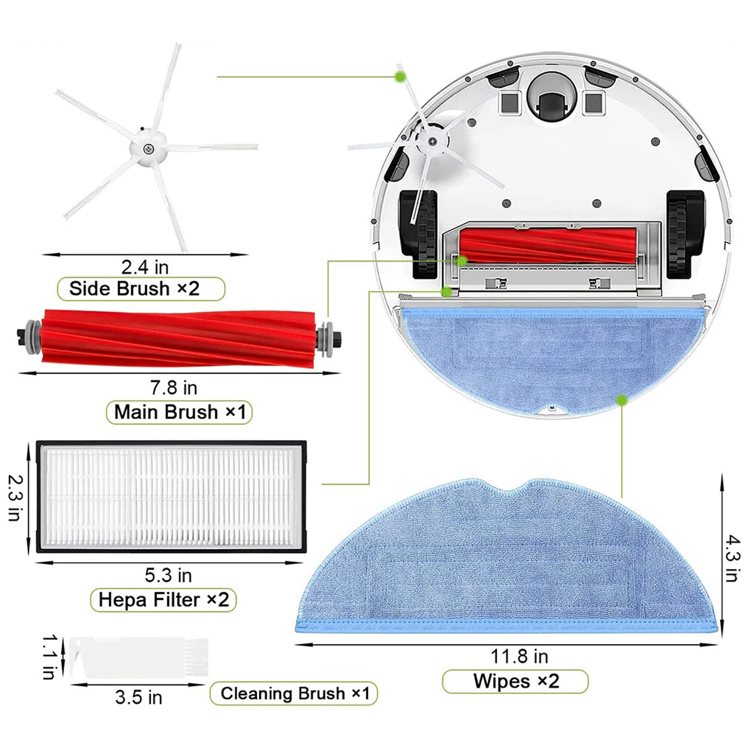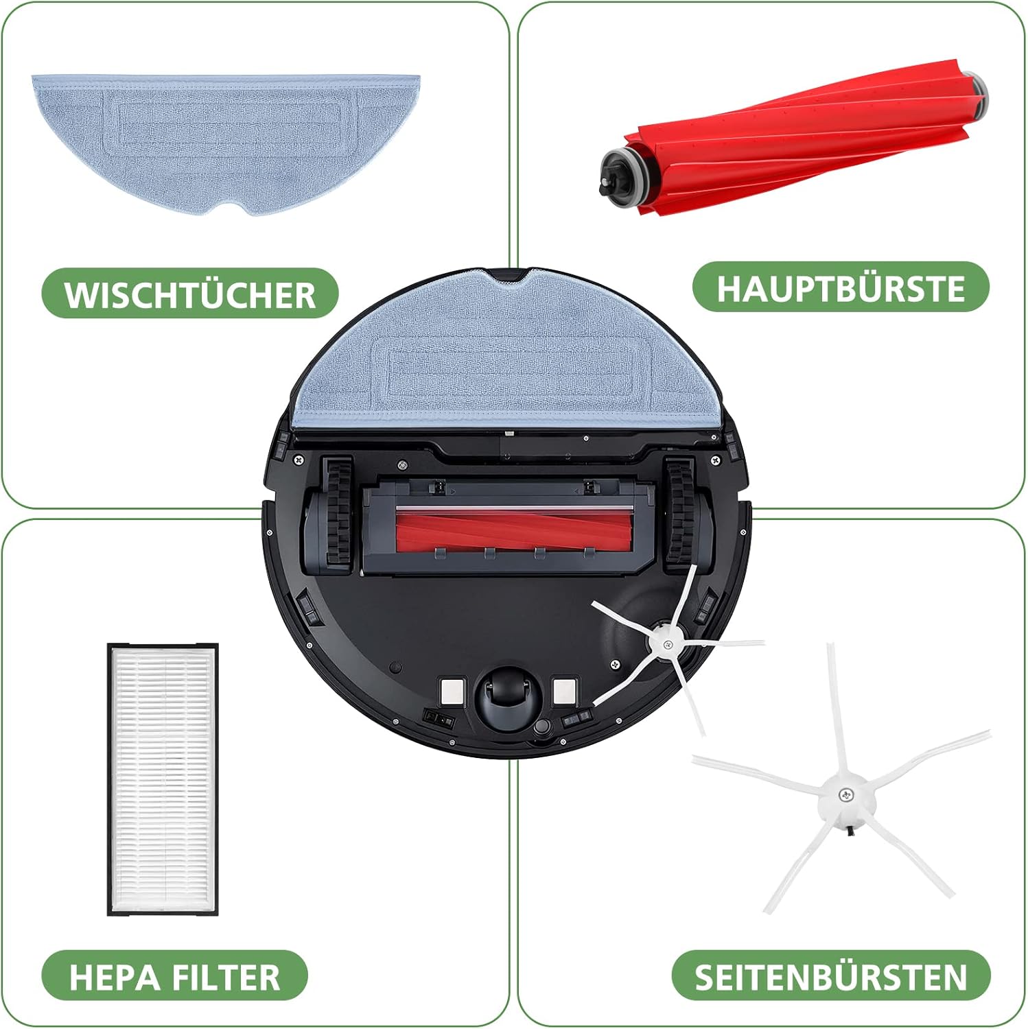 8 Stück/Satz enthalten Hauptbürste X1, Seitenbürste X2, Mopp X2, HEPA-Filter X2, Filterreinigungsbürste X1.