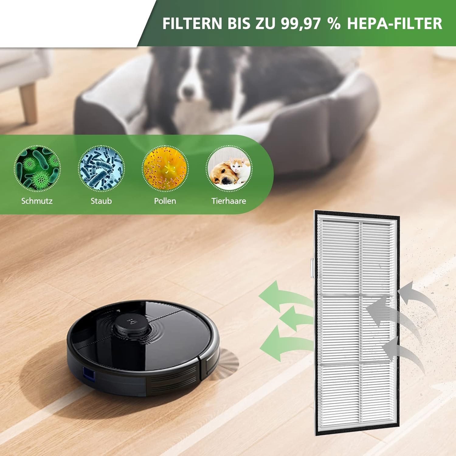Durch die hochwertige E11-Qualität und Teflonbeschichtung lassen sich die Filter leichter auswaschen. Der hocheffiziente HEPA-Filter kann wie beim Originaldesign 99 % Schmutz, Haare und Staub entfernen.