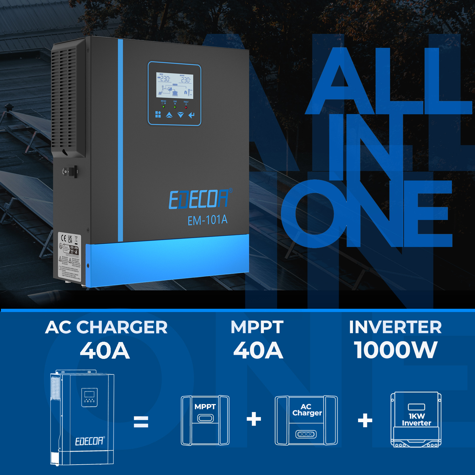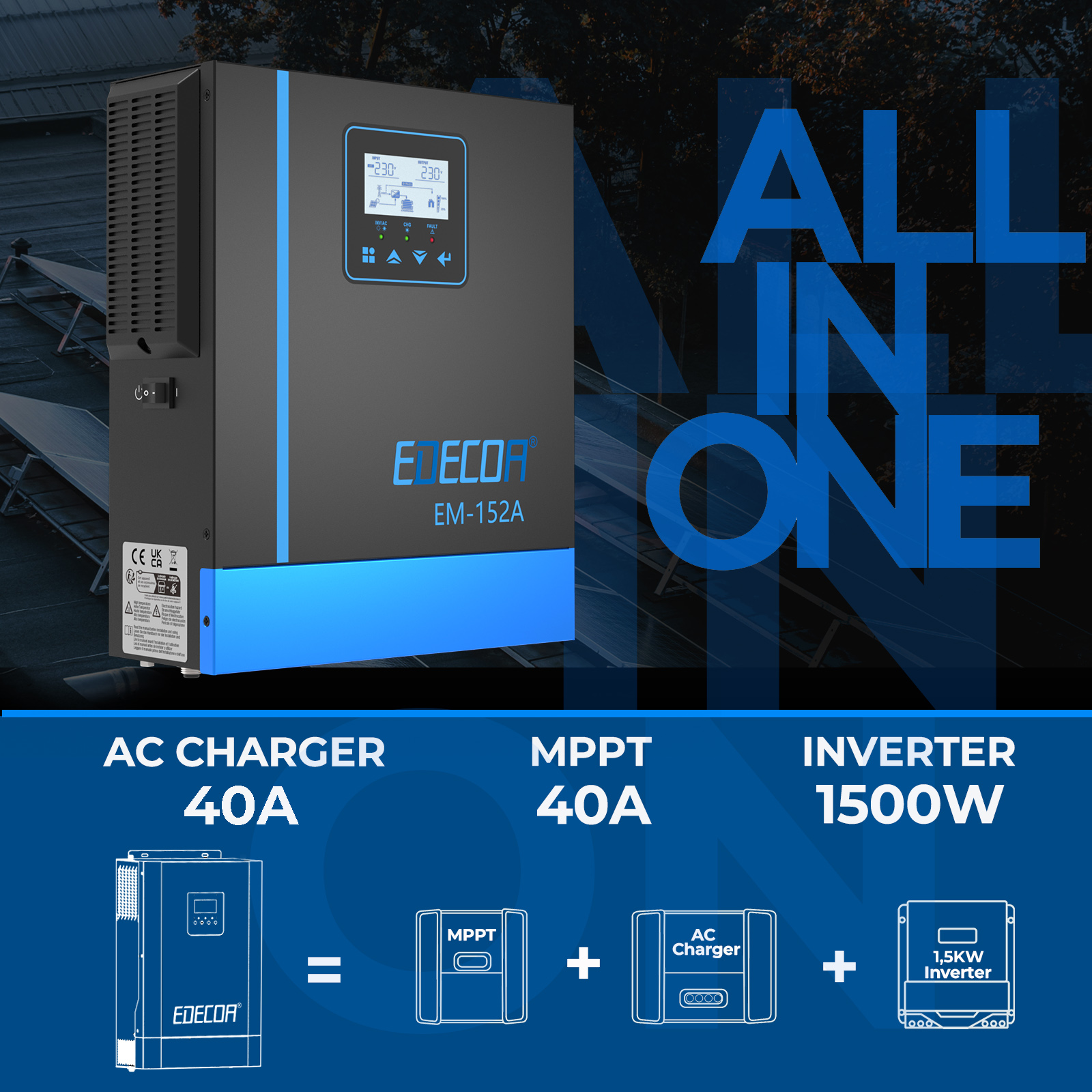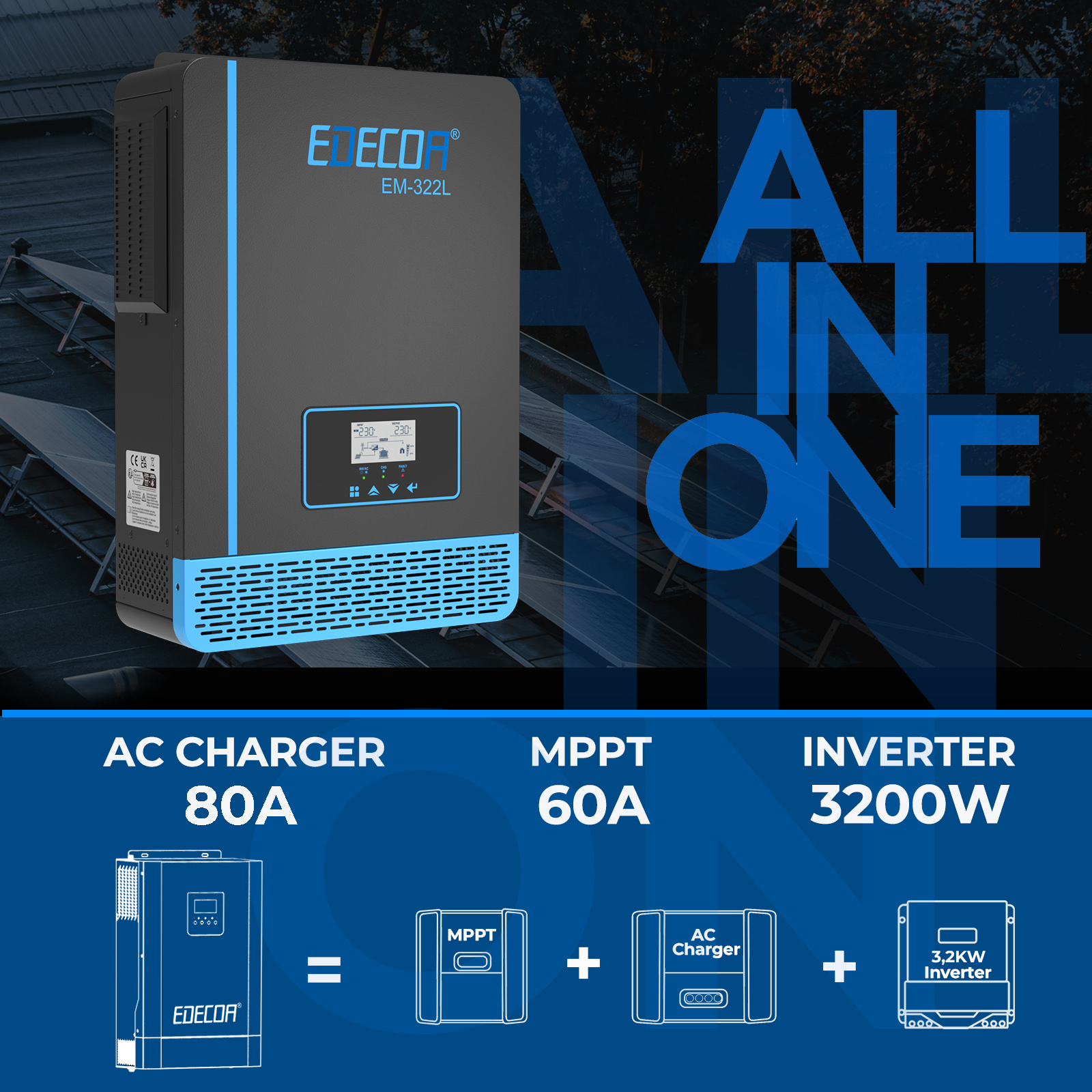Der intelligente EDECOA-Wandler kann eine kontinuierliche Leistung von 1000w/1500w/2000w/3200w/4200W/6200W/liefern. Indem man den Wandler an die Batterie anschließt, kann er von 12v/24V/48V Gleichstrom auf 220V/230V Wechselstrom bei 50Hz/60HZ umwandeln.