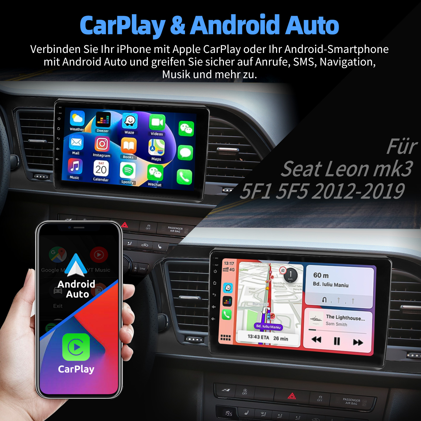 Drahtloses Carplay und Android Auto: Tauchen Sie ein in ein nahtloses und benutzerfreundliches Infotainment-Erlebnis mit Apple CarPlay & Android Auto. Verbinden Sie Ihr iPhone mit Apple CarPlay oder Ihr Android-Smartphone mit Android Auto und greifen Sie sicher auf Anrufe, Textnachrichten, Navigation, Musik und vieles mehr zu. Mit intuitiver Bedienung über den Touchscreen oder Sprachsteuerung haben Sie alle Funktionen bequem zur Hand, während Sie sicher am Steuer bleiben. Nutzen Sie Ihre bevorzugten Apps und bleiben Sie jederzeit verbunden, während Sie den Blick auf die Straße gerichtet haben. Machen Sie Ihr Fahrzeug zu einem erweiterten Hub für Ihre mobilen Geräte und erleben Sie eine neue Dimension des Infotainments.