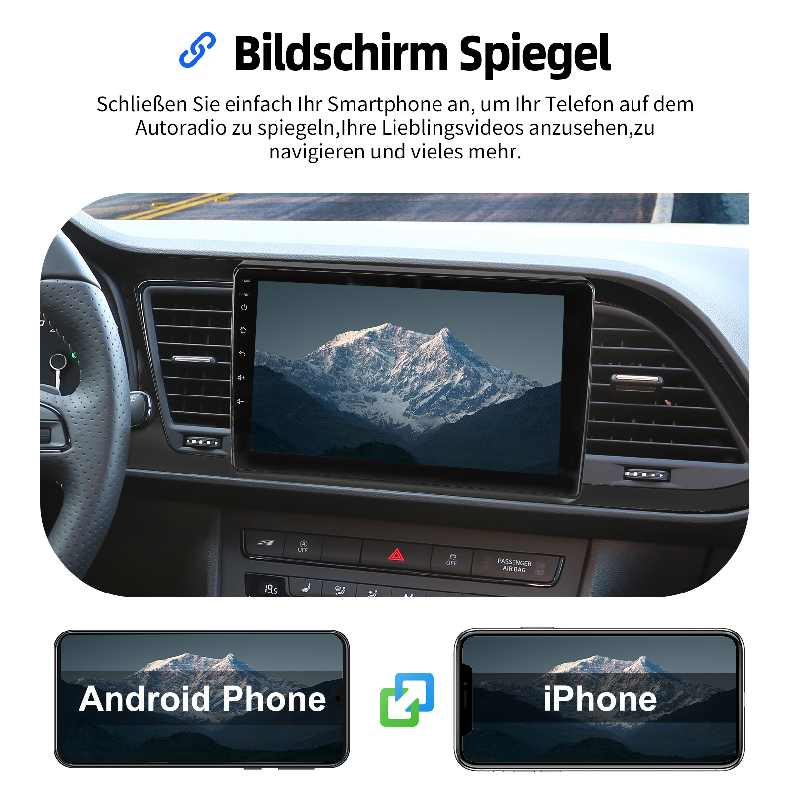 Bildschirm Spiegel für iOS/Android: Das Autoradio unterstützt Mirror Link für iOS/Android. Nachdem Sie das Radio angeschlossen haben, können Sie die Telefonseite mit dem 9-Zoll-Touchscreen des Radios synchronisieren. Das iPhone stellt eine Verbindung über WLAN her, und das Android-Telefon stellt eine Verbindung über WLAN oder das Original-USB-Kabel her (gilt nicht für Samsung- und Huawei-Telefone).