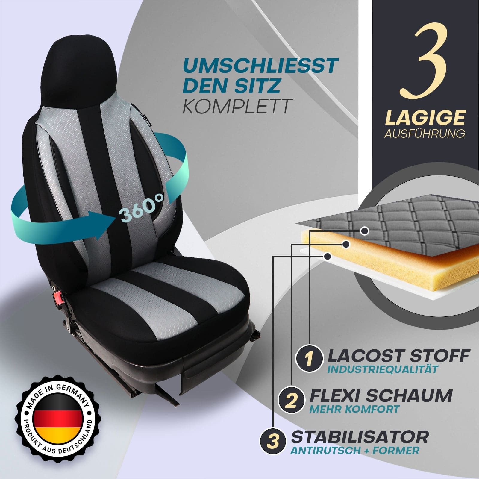 Dank der sorgfältigen Materialauswahl aus strapazierfähigem, atmungsaktivem Polyester und hochwertigem Lakoste-Gewebe sind die Bezüge robust, schmutzabweisend und pflegeleicht. Sie schützen Ihre Originalsitze vor Abnutzung und verleihen dem Innenraum eine moderne, hochwertige Optik. Verstärkte Nähte garantieren eine hohe Strapazierfähigkeit und lange Lebensdauer.