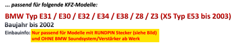 | Bitte beachten Sie das sich die Passgenauigkeit im Bezug auf das Fahrzeug NUR auf den Anschluss des Fahrzeuges bezieht und NICHT auf die Passform des Subwoofers! Denn je nach Ausstattung sind nicht alle Modelle Identisch. Bitte prüfen Sie IMMER VOR DEM KAUF ob der Subwoofer in ihrem Fahrzeug / Reserverradmulde etc. passt! Die Maße finden Sie in der Artikelbeschreibung weiter unten! Andere Sets mit anderen Subwoofern finden Sie bei uns im Shop. |