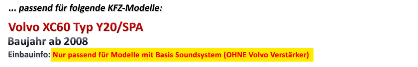 | Bitte beachten Sie das sich die Passgenauigkeit im Bezug auf das Fahrzeug NUR auf den Anschluss des Fahrzeuges bezieht und NICHT auf die Passform des Subwoofers! Denn je nach Ausstattung sind nicht alle Modelle Identisch. Bitte prüfen Sie IMMER VOR DEM KAUF ob der Subwoofer in ihrem Fahrzeug / Reserverradmulde etc. passt! Die Maße finden Sie in der Artikelbeschreibung weiter unten! Andere Sets mit anderen Subwoofern finden Sie bei uns im Shop. |