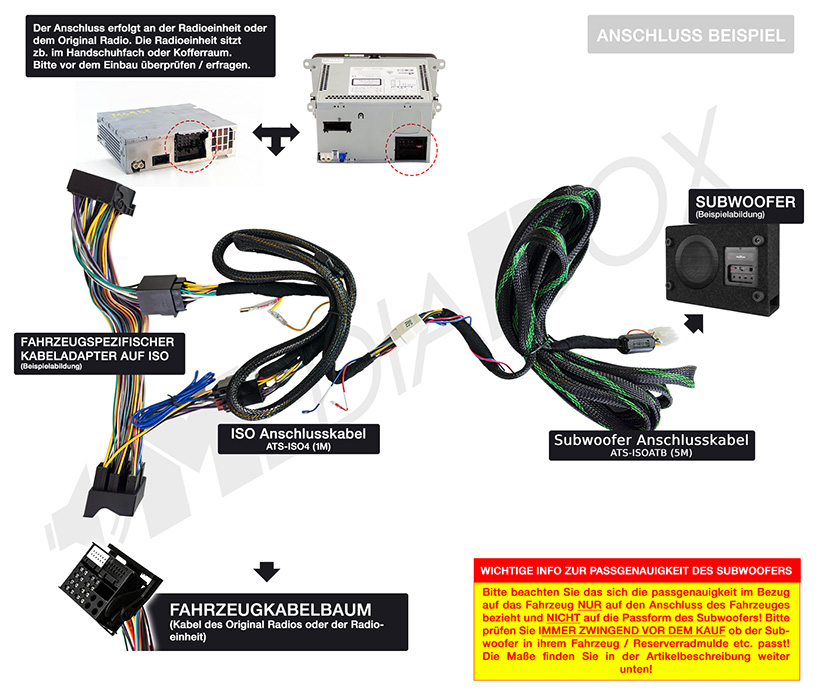 Die mitgelieferten Kabeladapter für den Soundabgriff und der Stromversorgung des Subwoofers werden zwischen dem verbauten -Werksradio/der Radioeinheit- und dem Original Kabelbaum des Fahrzeuges angeschlossen. Sie müssen keine extra Stromkabel oder Cinchkabel mehr verlegen!