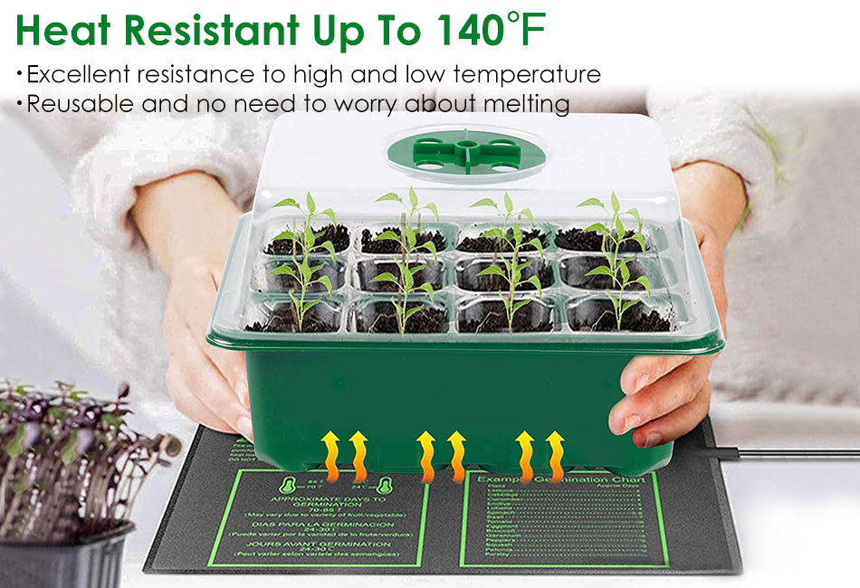 - *Perfect Partner For Heating Mat:Heat resistant up to 140℉,these seedling trays are strong enough to be used on a heat mat and no-worry about melting. Come with labels and dual garden tools,they help you mark the vegetables and planting. Highly transparent plastic cover and compartment tray,it allow you to observe easily and record the growth of your plant. Enjoy the happiness of plant growth.