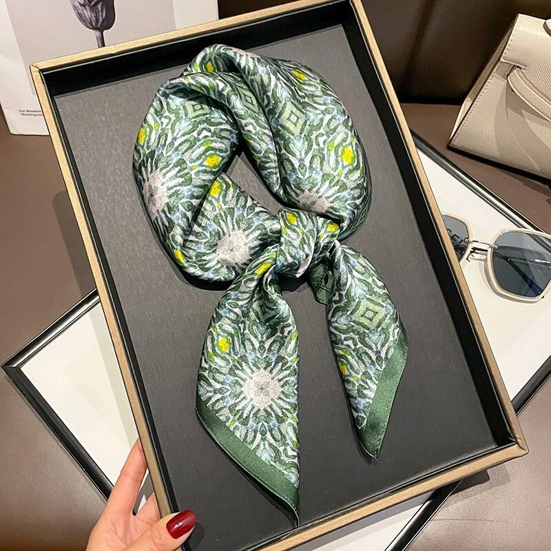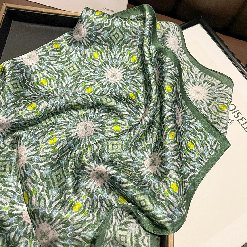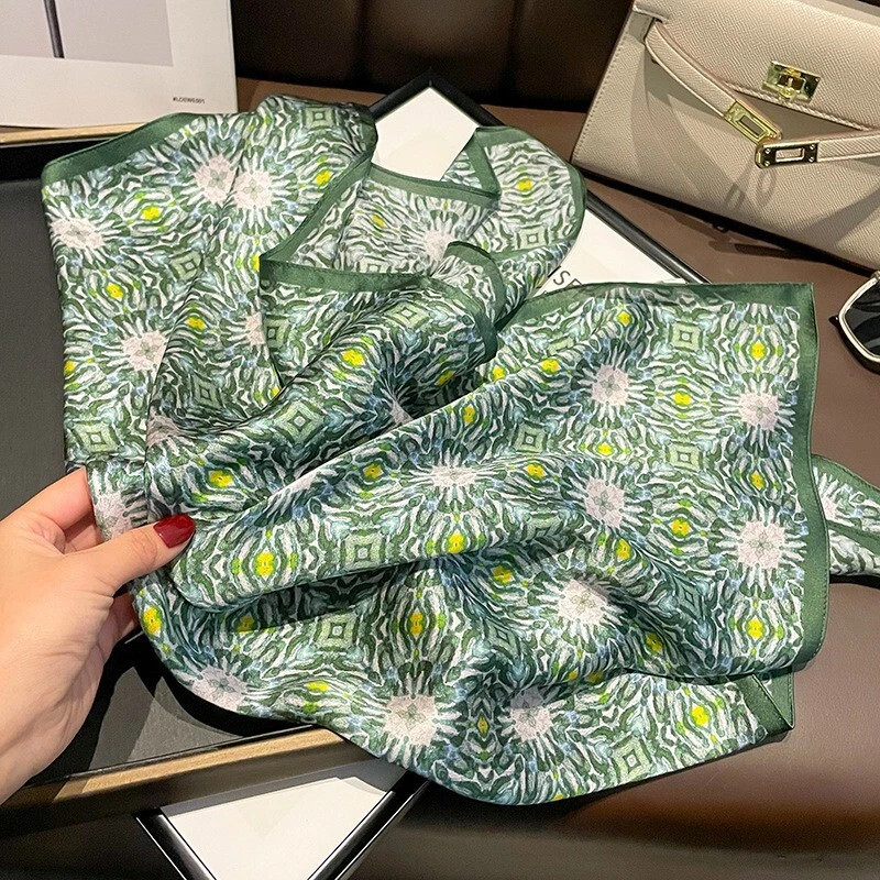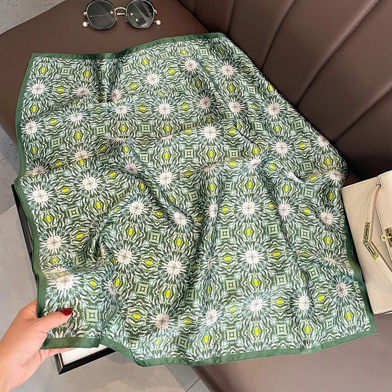100% Silk Mulberry 27" Square Scarf Women Neckerchief Wrap Green White Flowers