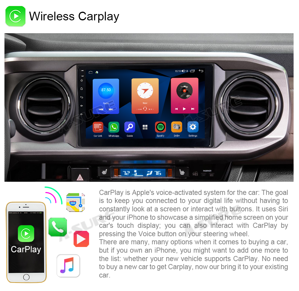 - Apple Carplay: wired or wireless Carplay in-vehicle system can closely integrate the user's iOS device and iOS experience with the dashboard system. Users who use wireless Carplay can connect to the car system via Bluetooth to realize voice-controlled navigation, make calls, send and receive messages, and listen to music. It is only available for iPhone