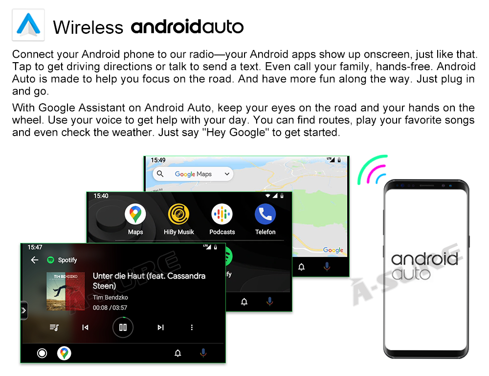 - Android Auto: wired or wireless Android auto in-vehicle system can closely integrate the user's Android device and Android experience with the dashboard system. Users who use wireless Android auto can connect to the car system via Bluetooth to realize voice-controlled navigation, make calls, send and receive messages, and listen to music. It is only available for Android phone(Android phones need to download android auto APP)