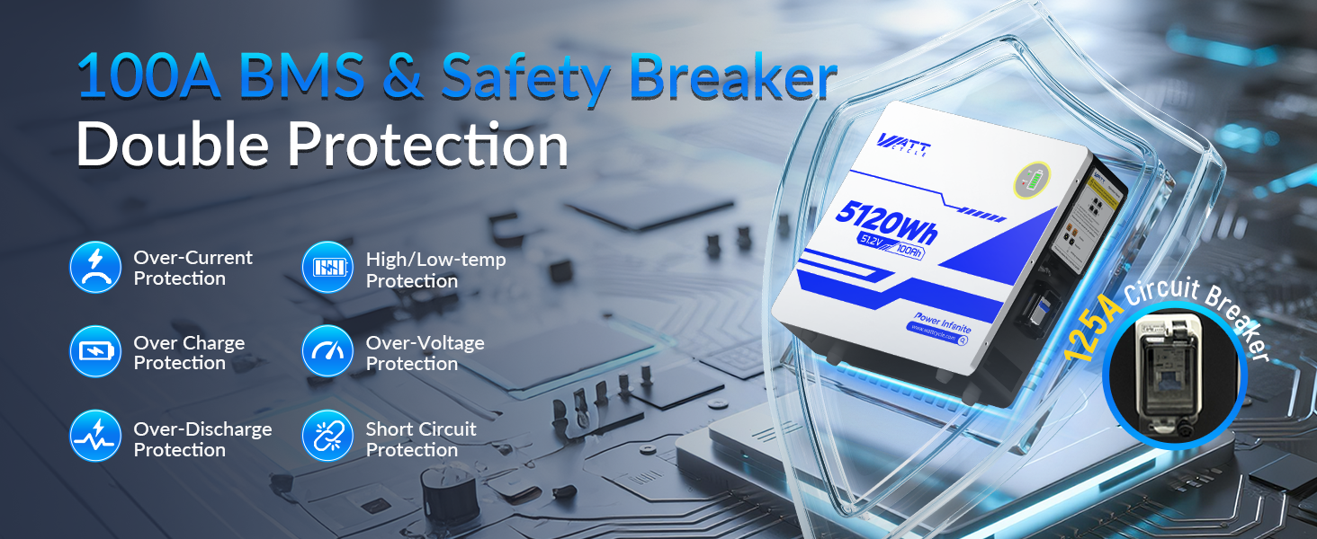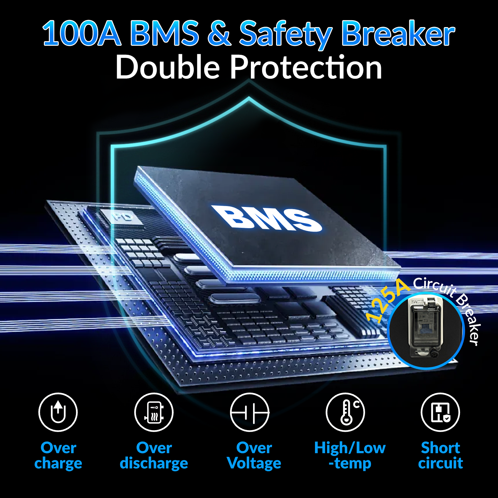 Die eingebaute intelligente BMS (Batteriemanagementsystem) schützt vor Überladung, Tiefentladung, Kurzschluss, Überstrom und extremen Temperaturen. Ein externer Schutzschalter fügt eine zusätzliche Ebene zuverlässiger Sicherheit hinzu.