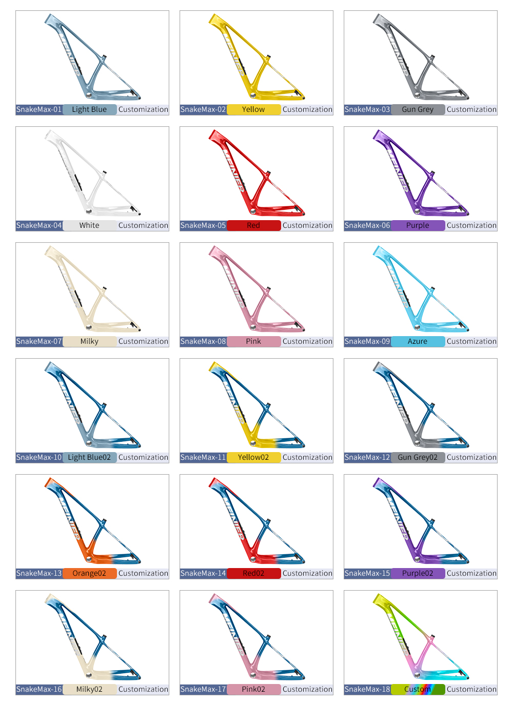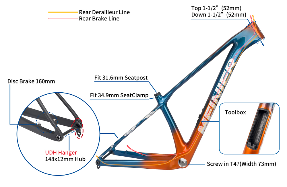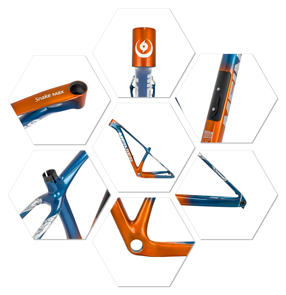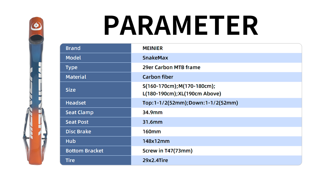 29 Zoll MEINIER-SNAKE MAX Kohlenstofffaser MTB UDH Scheibenbremse Rahmen Marke: MEINIER Modell:MEINIER-SNAKE MAX Typ:29 Zoll Carbon MTB Rahmen UDH Mountainbike Scheibenbremse Rahmen Material: Kohlenstofffaser Größe: S/M/L/XL Steuersatz:Oben: 1-1/2" (52 mm); Unten: 1-1/2" (52 mm) Passend für Sattelstütze:31,6 mm Passend für Sattelklemme:34,9 mm Scheibenbremse: 160 mm Nabe: Vorne: 148 x 12 mm Tretlager: Schraubgewinde T47 (73 mm) Reifen:29 x 2,4 Zoll UDH Aufhänger