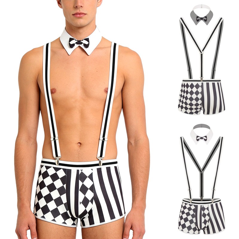 The fake collar is adorned with a bowtie. The stockings are printed plaids. Gloves are silky to wear.