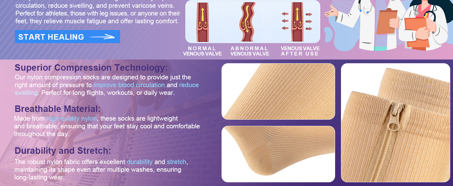 The zip compression stockings can maximize provide compression at the ankle and reduce pressure on the calf gradually, which reduces venous reflux of the lower extremity.Maintain positive blood circulation and leg health.