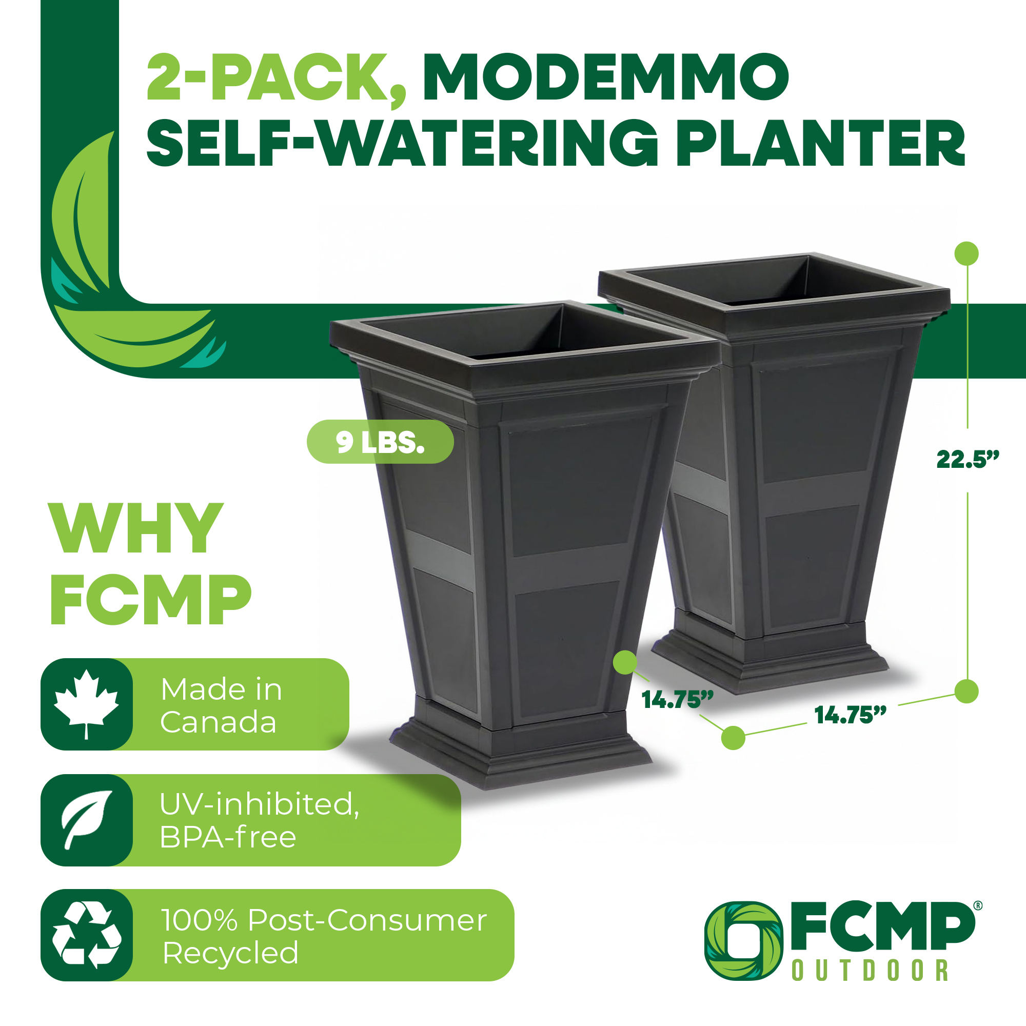 The FCMP Outdoor Modemmo Self-Watering Planters combine modern design with everyday functionality to enhance both indoor and outdoor décor. Featuring a tall square silhouette and a clean, decorative finish, these planters create a stylish accent for front doors, patios, porches, decks, and garden spaces. Their versatile design allows them to function as self-watering planters or as decorative vessels for dropping in your favorite potted plants.