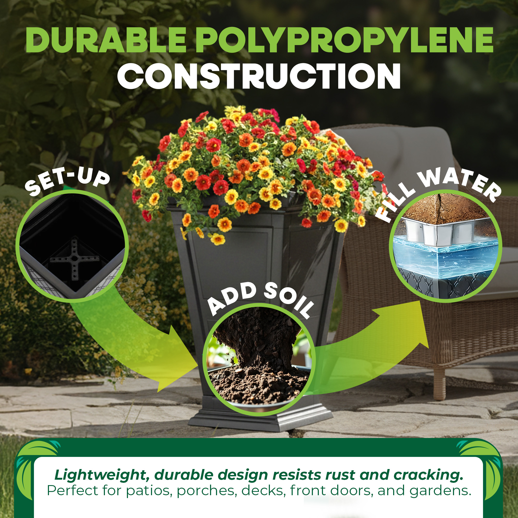 Constructed from durable polypropylene, these planters are BPA-free, UV-inhibited, and resists rust and fading. Made in Canada using 100% post-consumer recycled plastic, they support a circular economy while delivering reliable performance in changing weather conditions. Despite their sturdy build, the lightweight design allows for easy repositioning around your space.