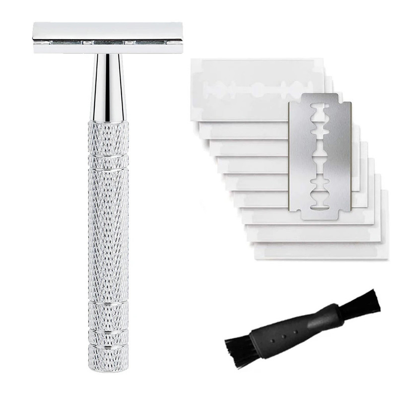 Ideal for bikini line, body, face, and underarm shaving, this razor is perfect for daily use and travel. Includes 10 stainless steel safety razor blades for long-lasting performance.