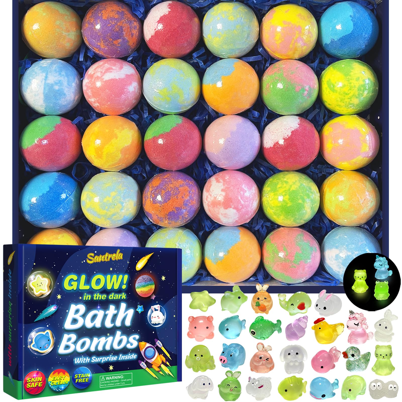 [BATH BOMBS WITH GLOW TOYS INSIDE] - Each set contains 30 Pack kids bath bombs with 30 pcs different glow in the dark toys inside. The special surprise toys that will make bath time even more enjoyable, bring your kids different experiences during the day and night.TIPS: If you want a better luminous effect, please put the small toy under direct light before use. They can absorb sunlight or light, the stronger the UV, the brighter they glow in the dark.