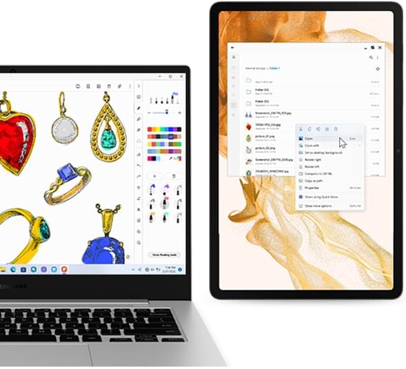 Connect your Galaxy Book2 Go 5G with a Galaxy Tab6 wirelessly to add a Second screen. You can duplicate or extend, and instantly work across both devices with Samsung Multi Control7.