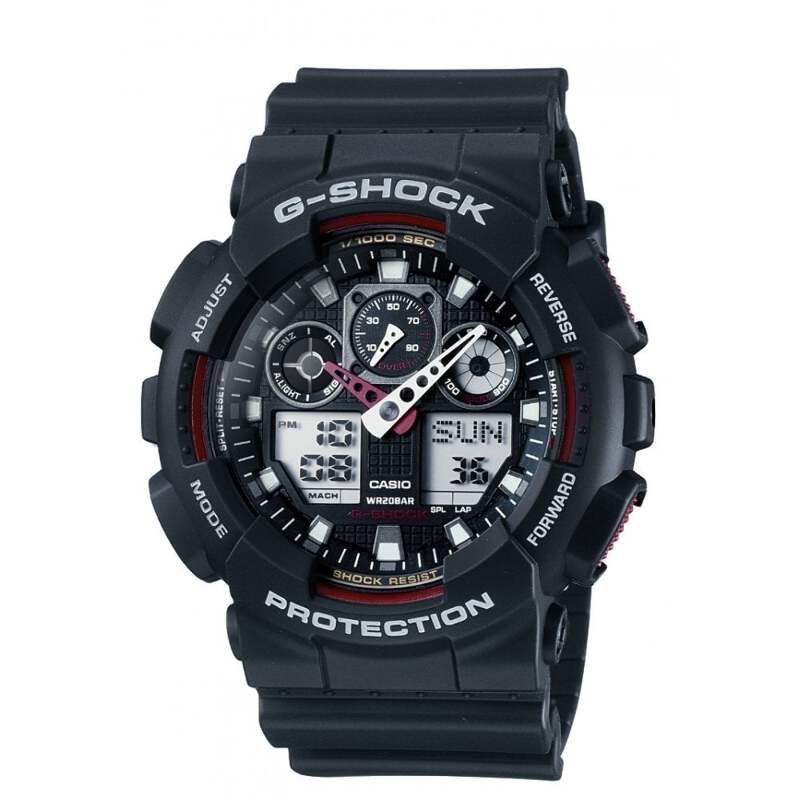 Featuring 35mm dials and large cases, G-SHOCK watches lend a sense of power and strength.Dial rings and raised hour markers create a 3D visual, complemented by a black finish and red accents.Made to resist shocks and water up to 200m, the GA-100-1A4ER comes with a black resin strap.Anti-slip technology is added to the over-sized buttons for fast and assured use.In addition to its 1/1000-second stopwatch, velocity indicator, World Time, and 5 alarms, this model offers unparalleled function and performance.