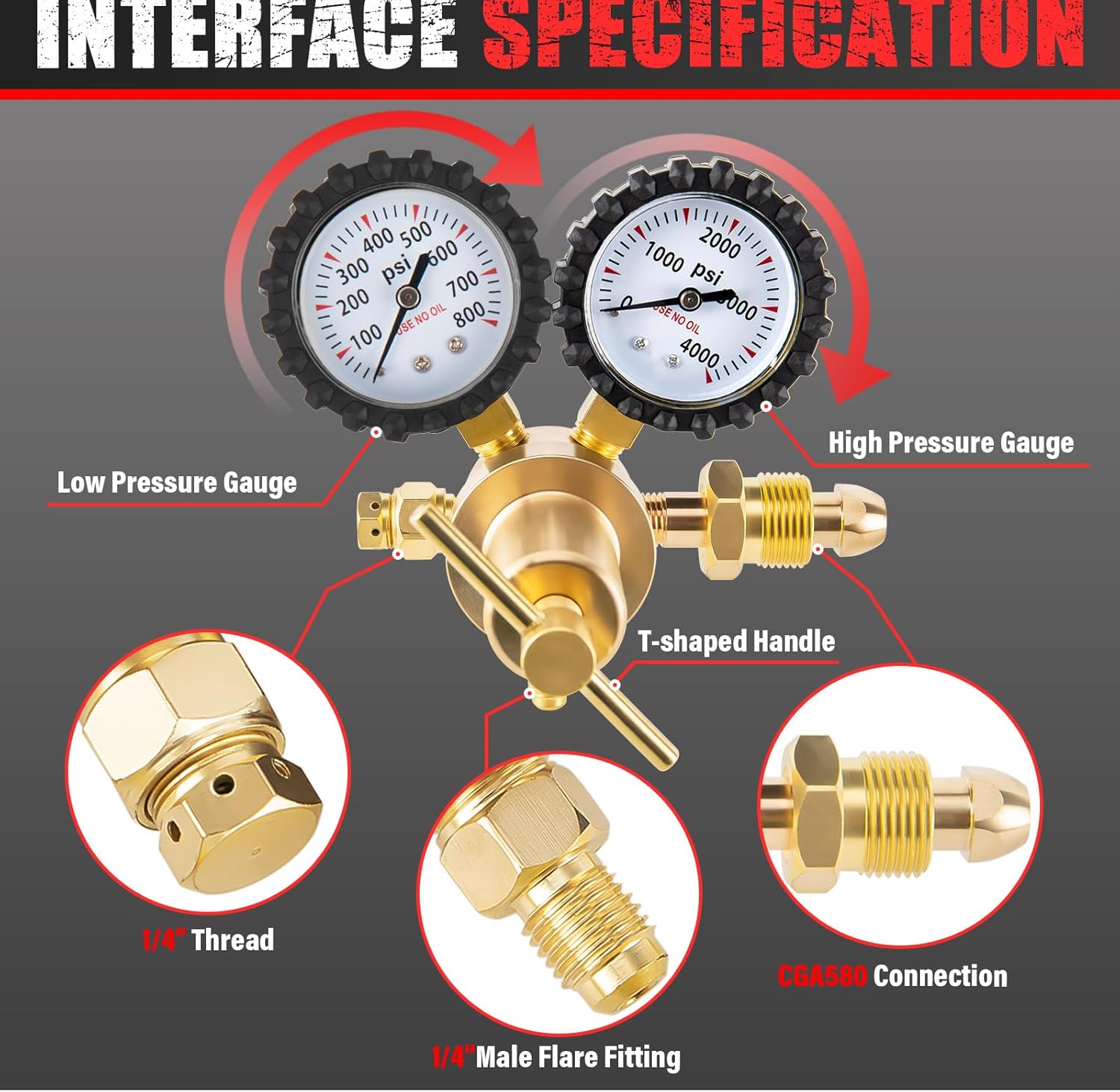 【Accurate Pressure Gauge】This pressure Nitrogen Requlator has two easy to read 2 inch pressuregauge with scratch-resistant plastic protective film and rubber cover Input: 0-4000PSl. Output:adjustable 0-400PSl. We can accurately read the index in the meter. NOTE: The gauge shows 600PSI thatyou can rate them at 400pSl, but they are able to go up to 600pSl.