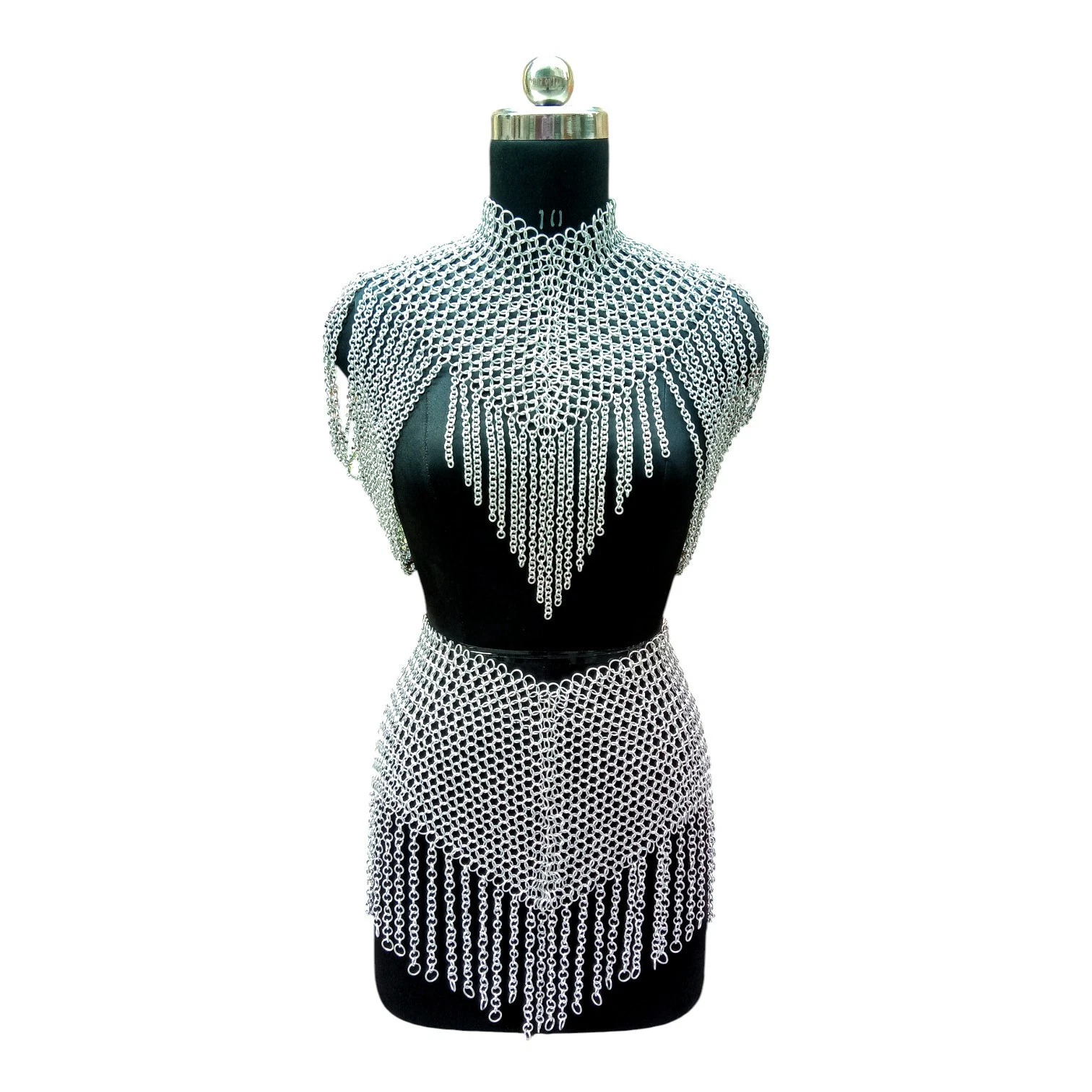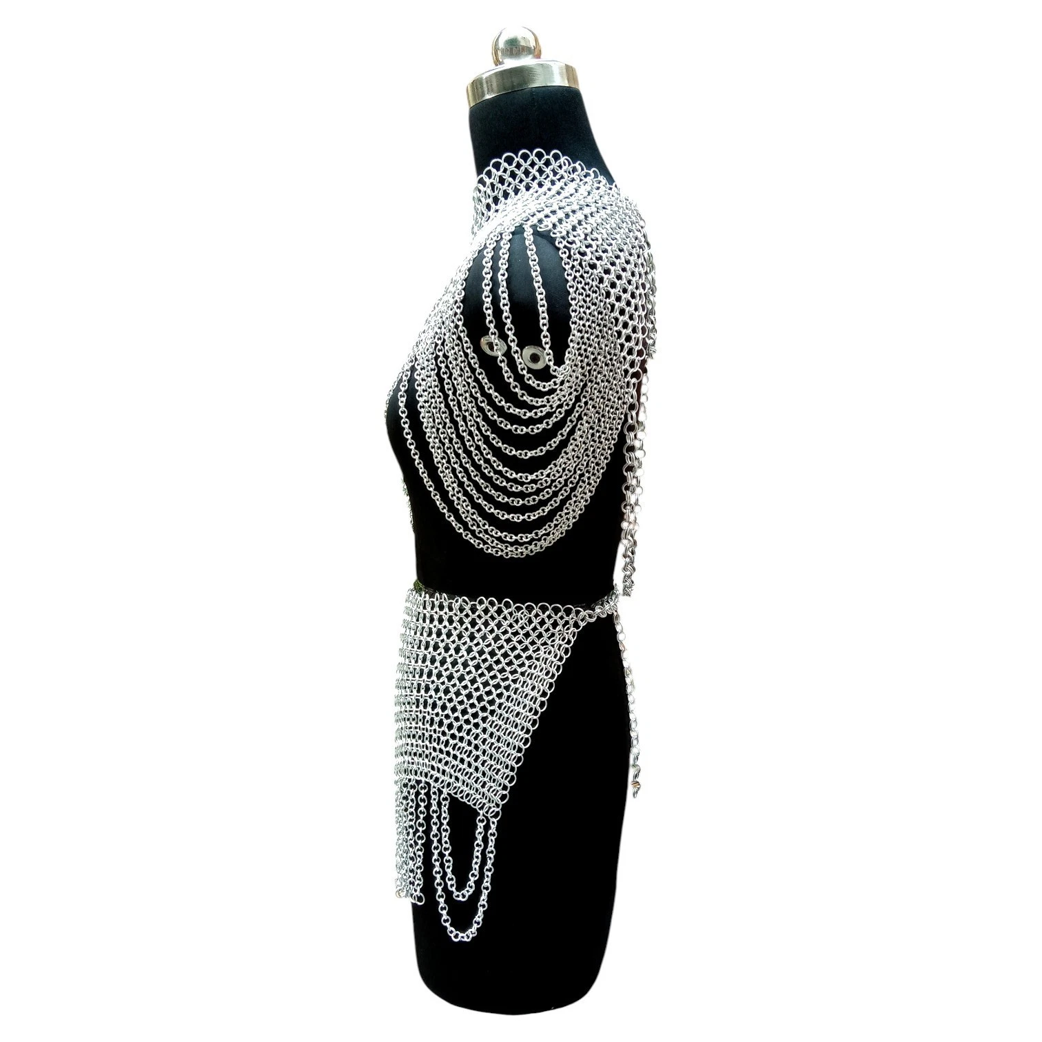This luxury aluminum chainmail armor for women is a premium chainmail top skirt set crafted for an authentic medieval chainmail costume. Ideal for women LARP armor, cosplay, and fantasy events.