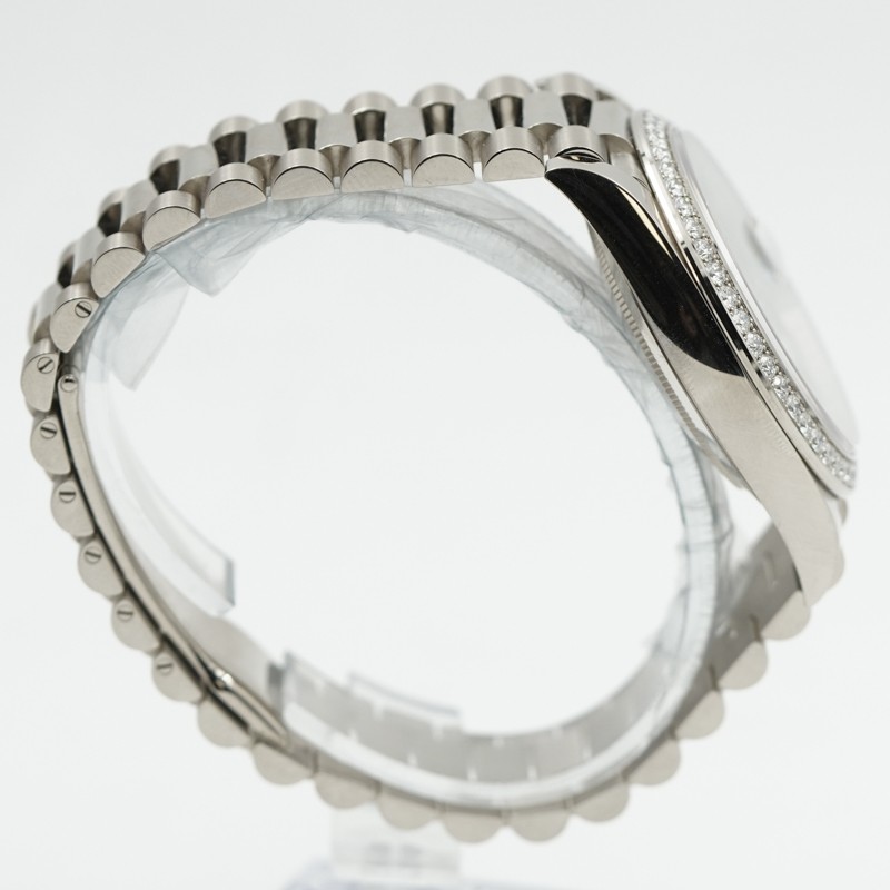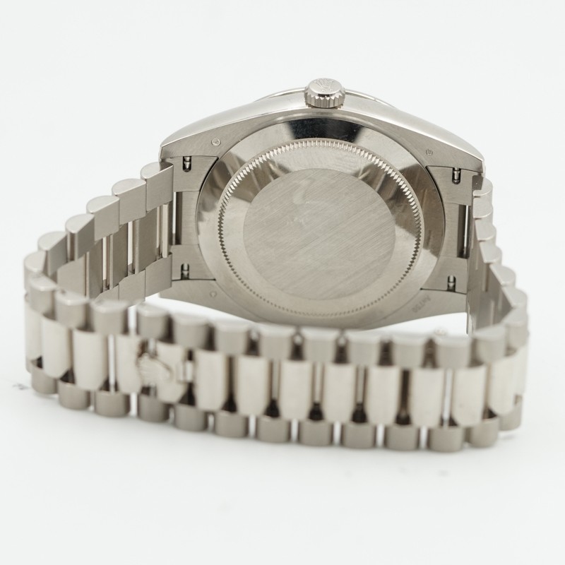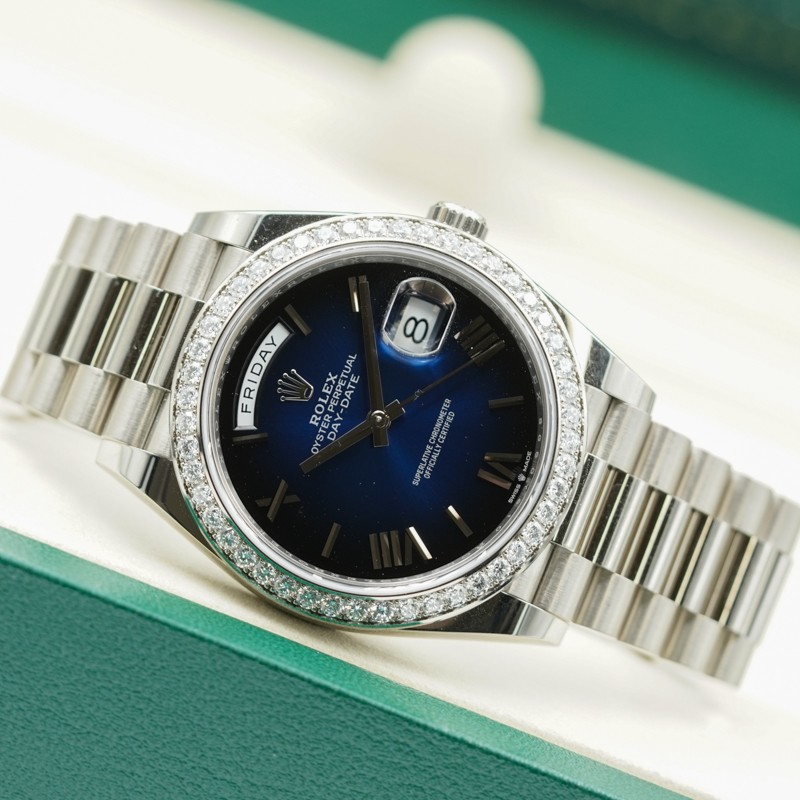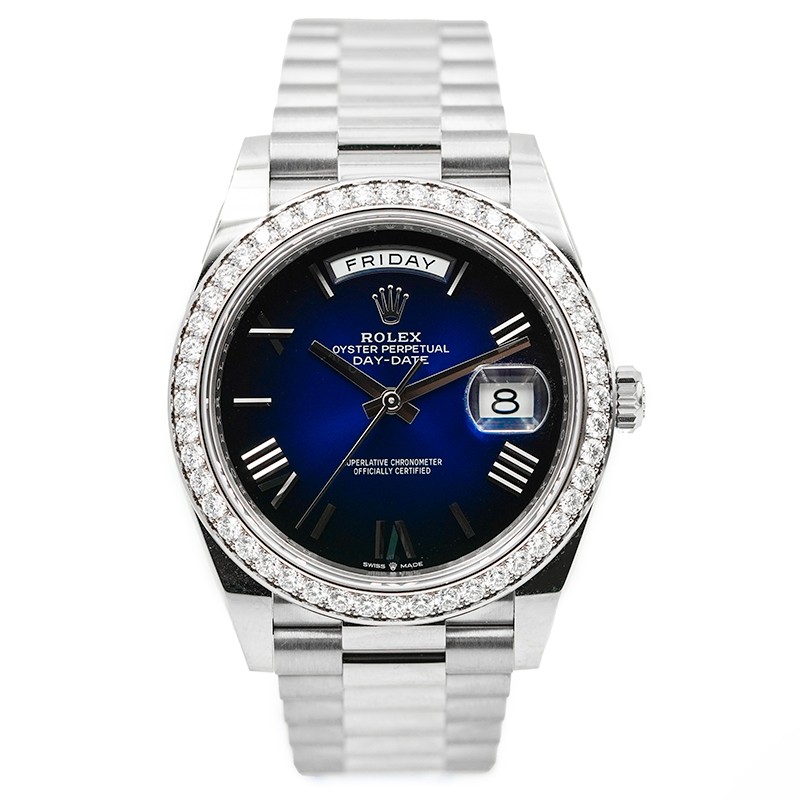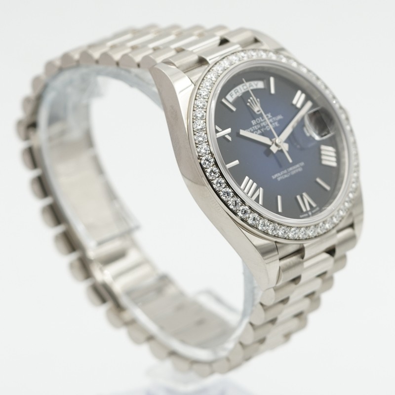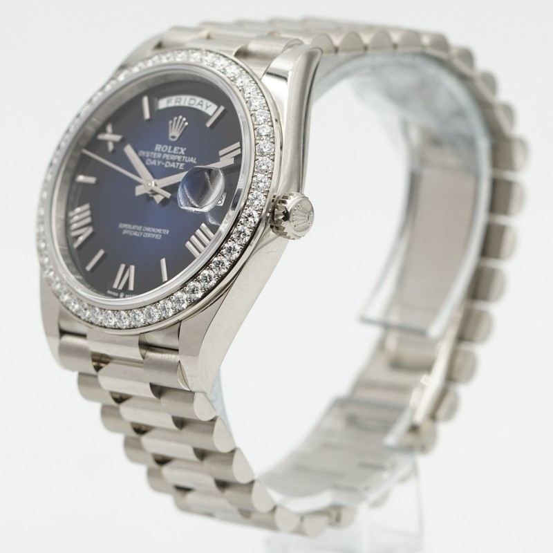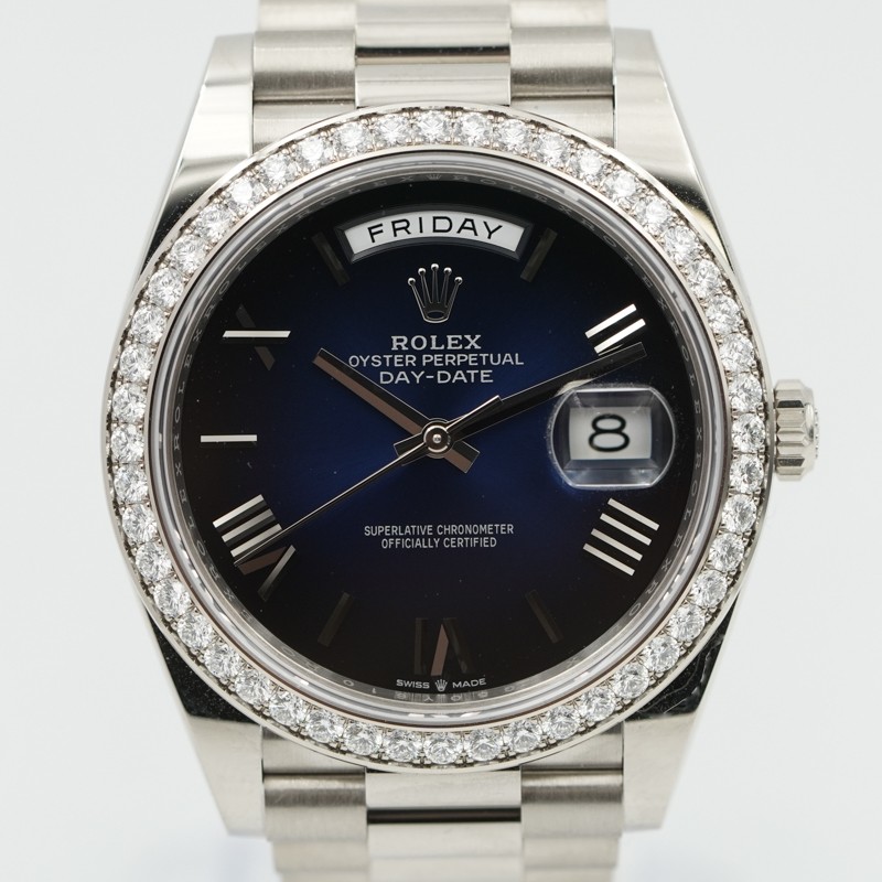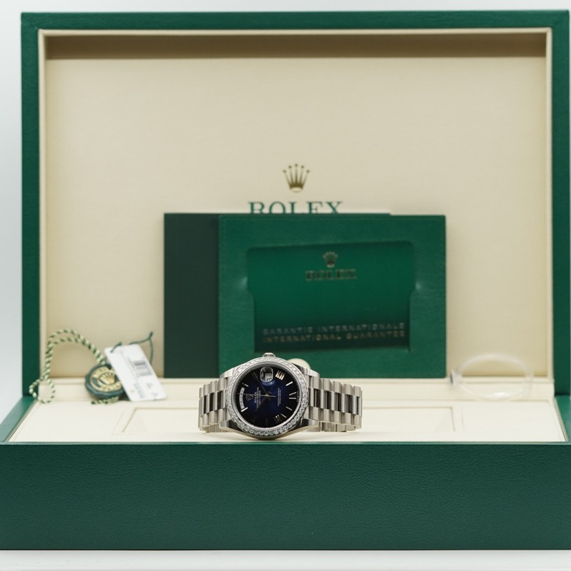 This 18k White Gold Rolex Day-Date was recently added to our pre-owned collection and is in very good condition. A stunning example of Rolex's most prestigious classic, the Day-Date 40 in 18K white gold with a richly graduated blue ombré dial and a factory diamond-set bezel. This reference features the iconic President bracelet, a sapphire crystal with Cyclops date magnifier, and Rolex?s in-house Calibre 3255 automatic movement with a ~70-hour power reserve and chronometer precision.