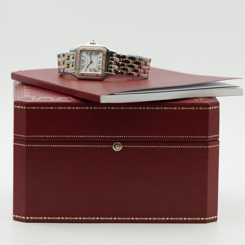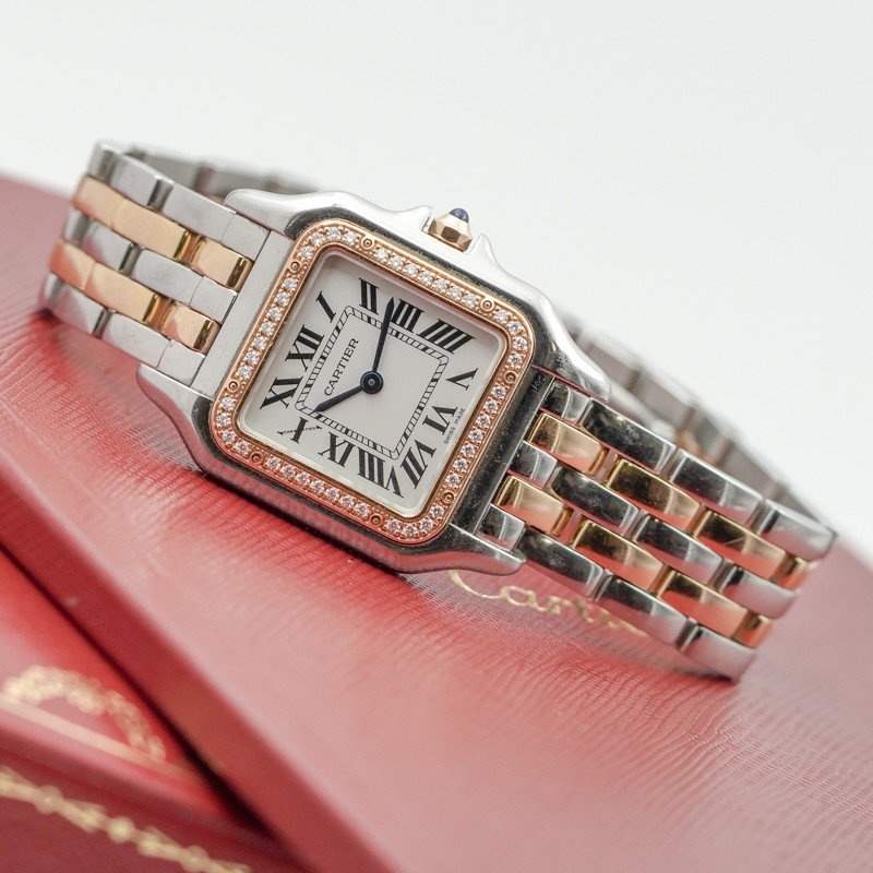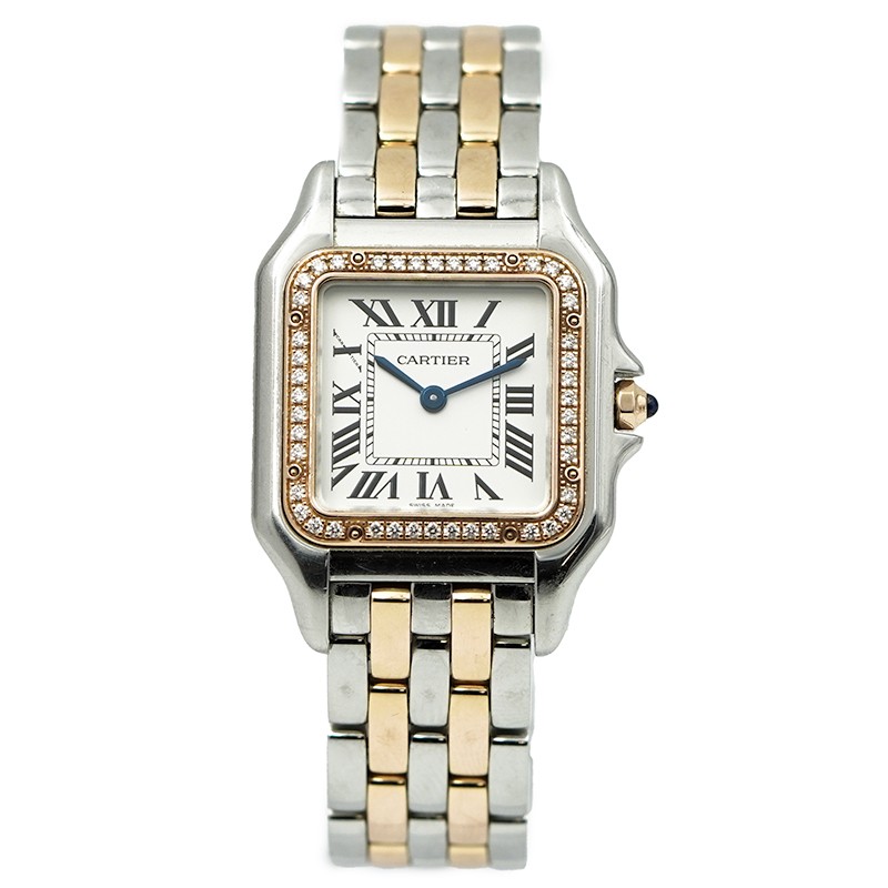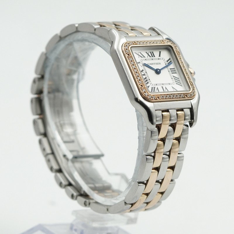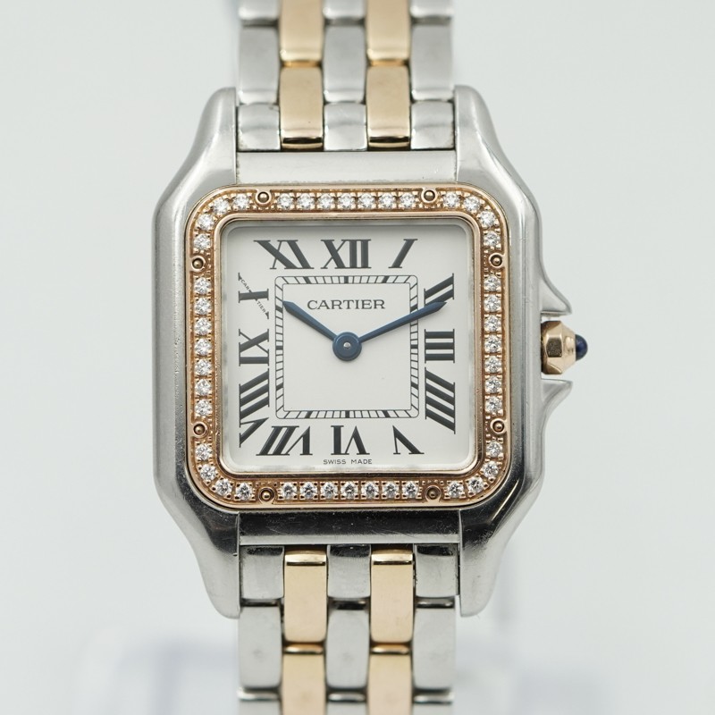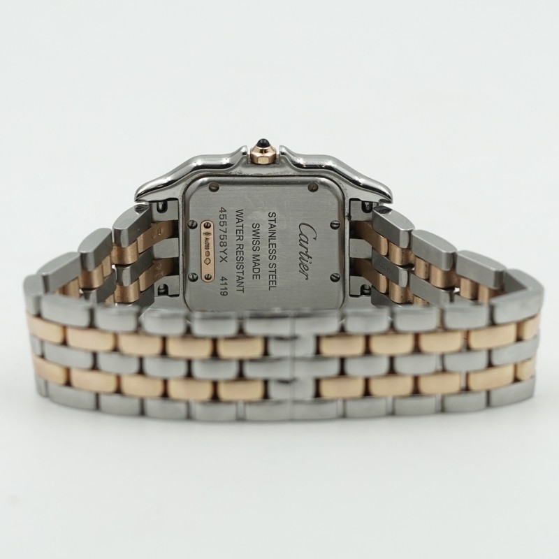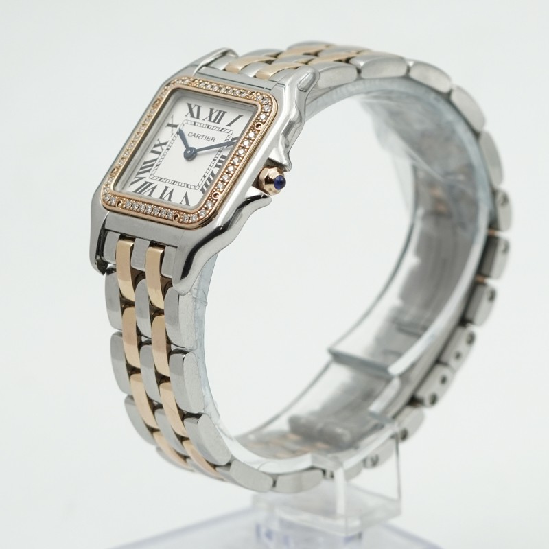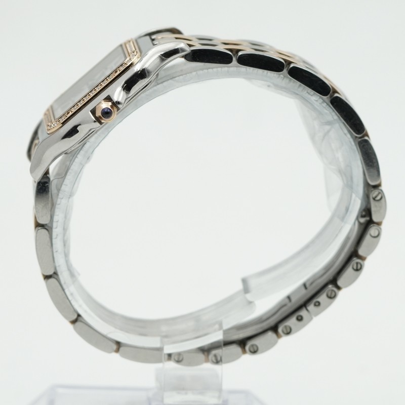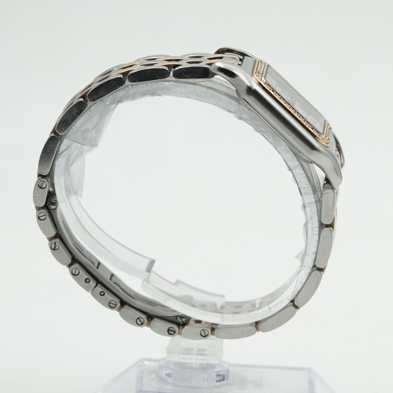 This Cartier Panthère de Cartier Medium W3PN0010 was recently added to our pre-owned case and is in very good condition. The watch is crafted in stainless steel and 18K rose gold and features a refined 29mm case and iconic Panthère bracelet. The silvered dial with Roman numerals and blued hands delivers timeless Cartier elegance, powered by a reliable quartz movement.