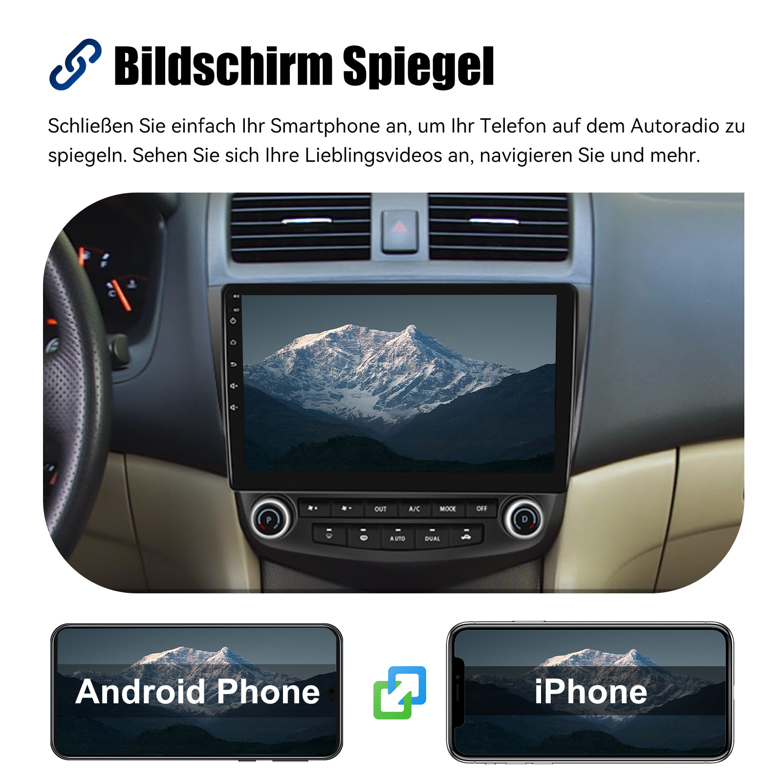 Bildschirm Spiegelfür iOS/Android: Das Autoradio unterstützt Mirror Link für iOS/Android-Telefone. Nachdem Sie das Radio angeschlossen haben, können Sie die Telefonseite mit dem 10-Zoll-Touchscreen des Radios synchronisieren. Das iPhone stellt eine Verbindung über WLAN her, und das Android-Telefon stellt eine Verbindung über WLAN oder das Original-USB-Kabel her (gilt nicht für Samsung- und Huawei-Telefone).