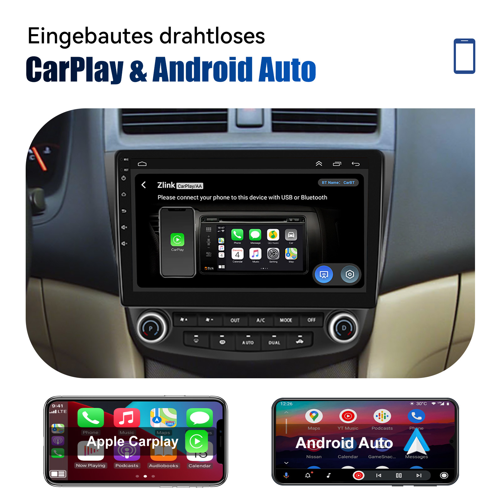 Wireless Carplay und Android Auto: Tauchen Sie ein in ein nahtloses und benutzerfreundliches Infotainment-Erlebnis mit Apple CarPlay & Android Auto. Verbinden Sie Ihr iPhone mit Apple CarPlay oder Ihr Android-Smartphone mit Android Auto und greifen Sie sicher auf Anrufe, Textnachrichten, Navigation, Musik und vieles mehr zu. Mit intuitiver Bedienung über den Touchscreen oder Sprachsteuerung haben Sie alle Funktionen bequem zur Hand, während Sie sicher am Steuer bleiben. Nutzen Sie Ihre bevorzugten Apps und bleiben Sie jederzeit verbunden, während Sie den Blick auf die Straße gerichtet haben. Machen Sie Ihr Fahrzeug zu einem erweiterten Hub für Ihre mobilen Geräte und erleben Sie eine neue Dimension des Infotainments.