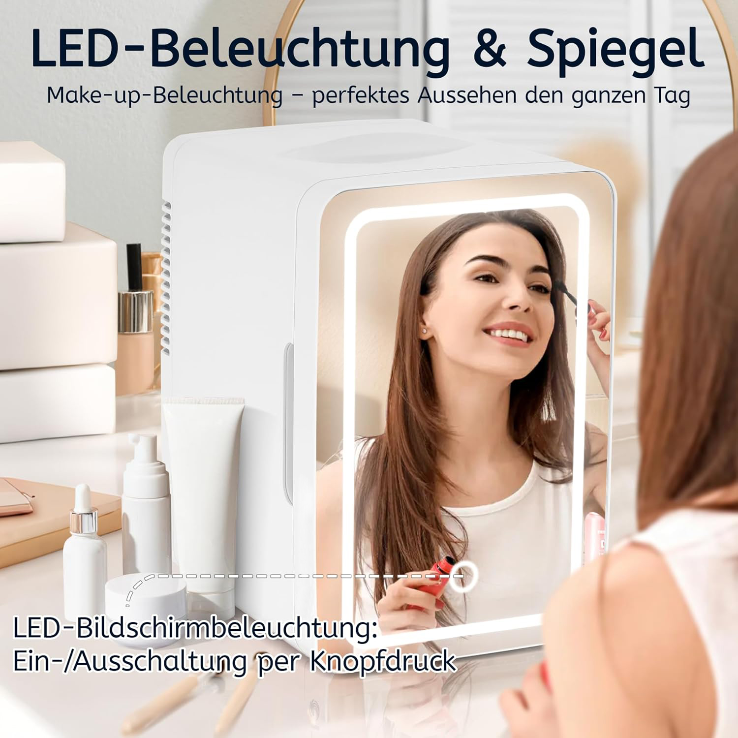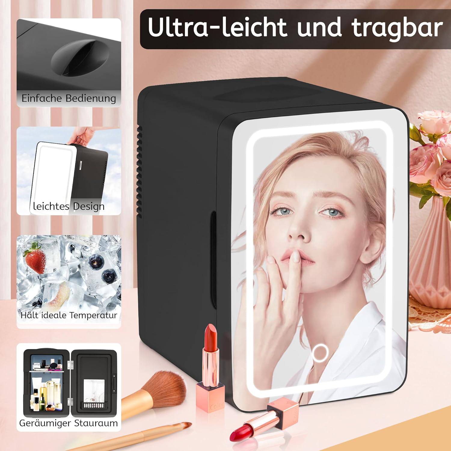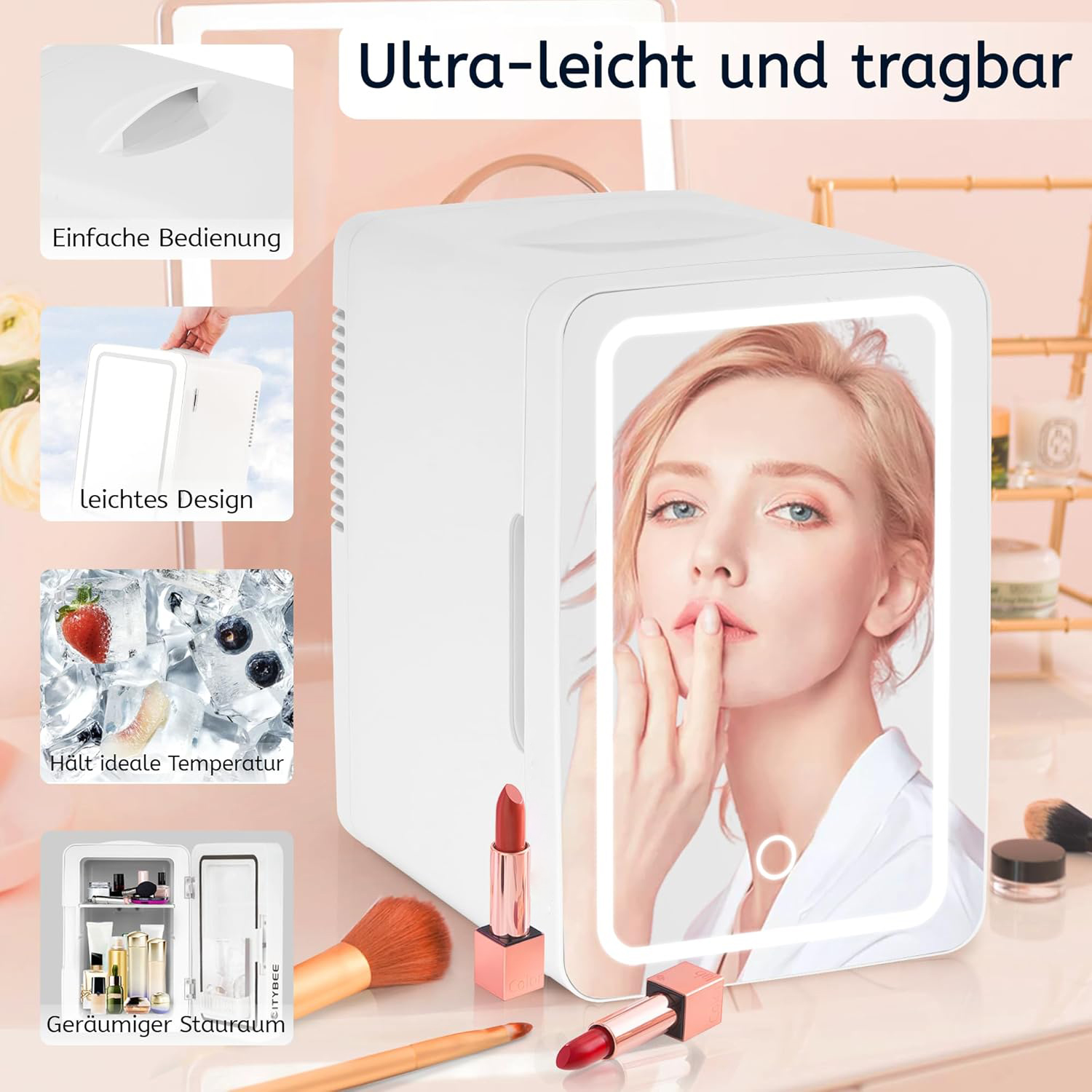 【LED-Beleuchtung & Spiegel】 Multifunktionaler Make-up-Kühlschrank mit Licht und Sicherheitsspiegel, der nur 2,3 kg wiegt Mini-Kühlschrank. Ob Sie Ihr tägliches Make-up perfektionieren oder eine nächtliche Hautpflege durchführen, der Spiegel sorgt für klares Licht.
