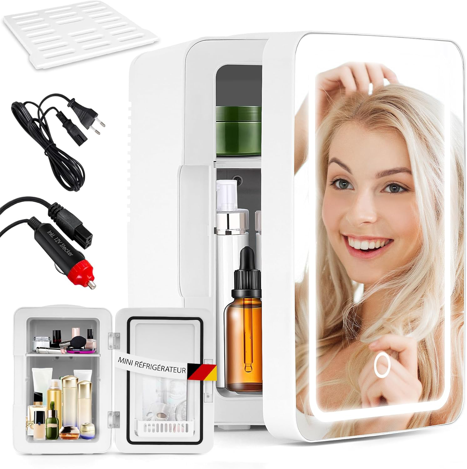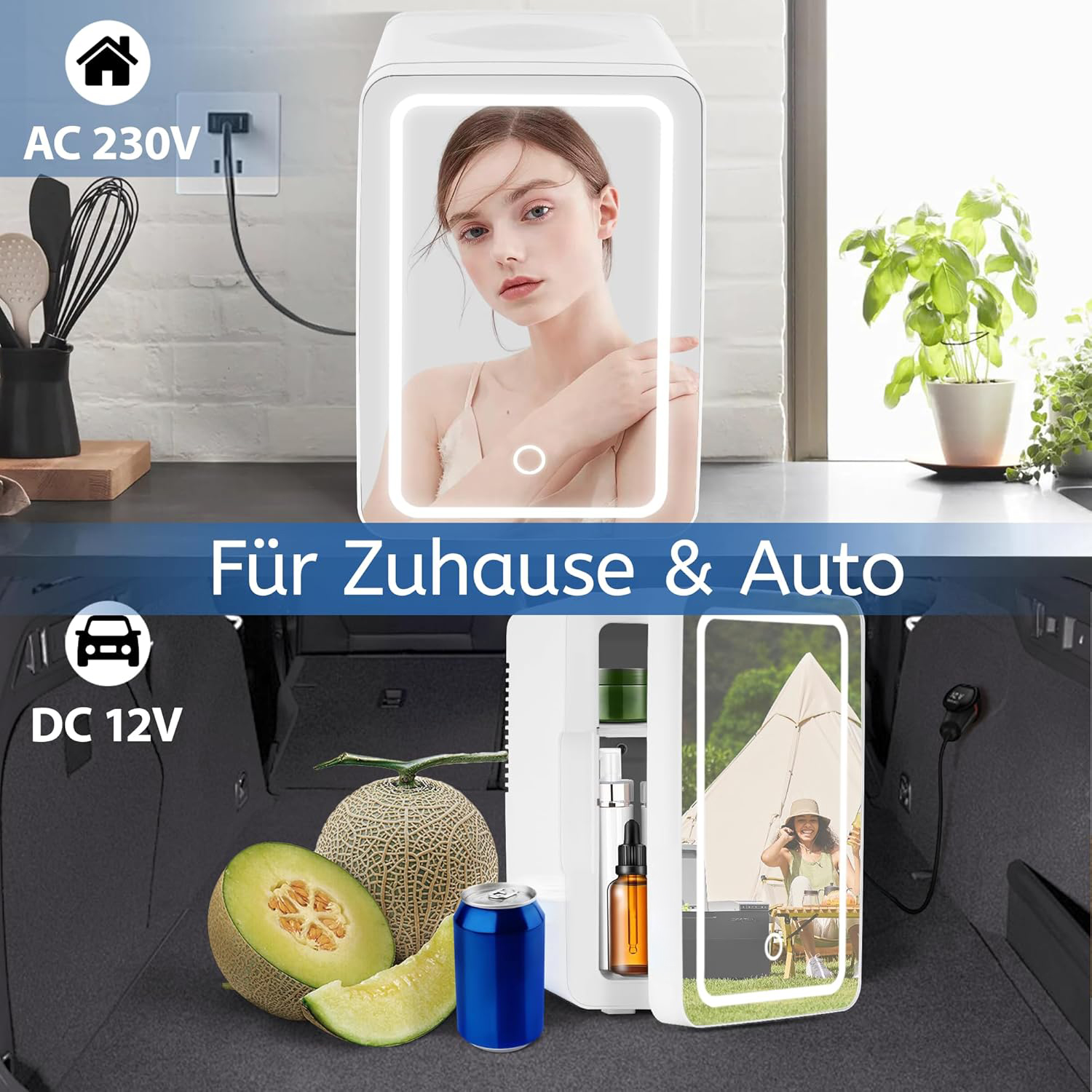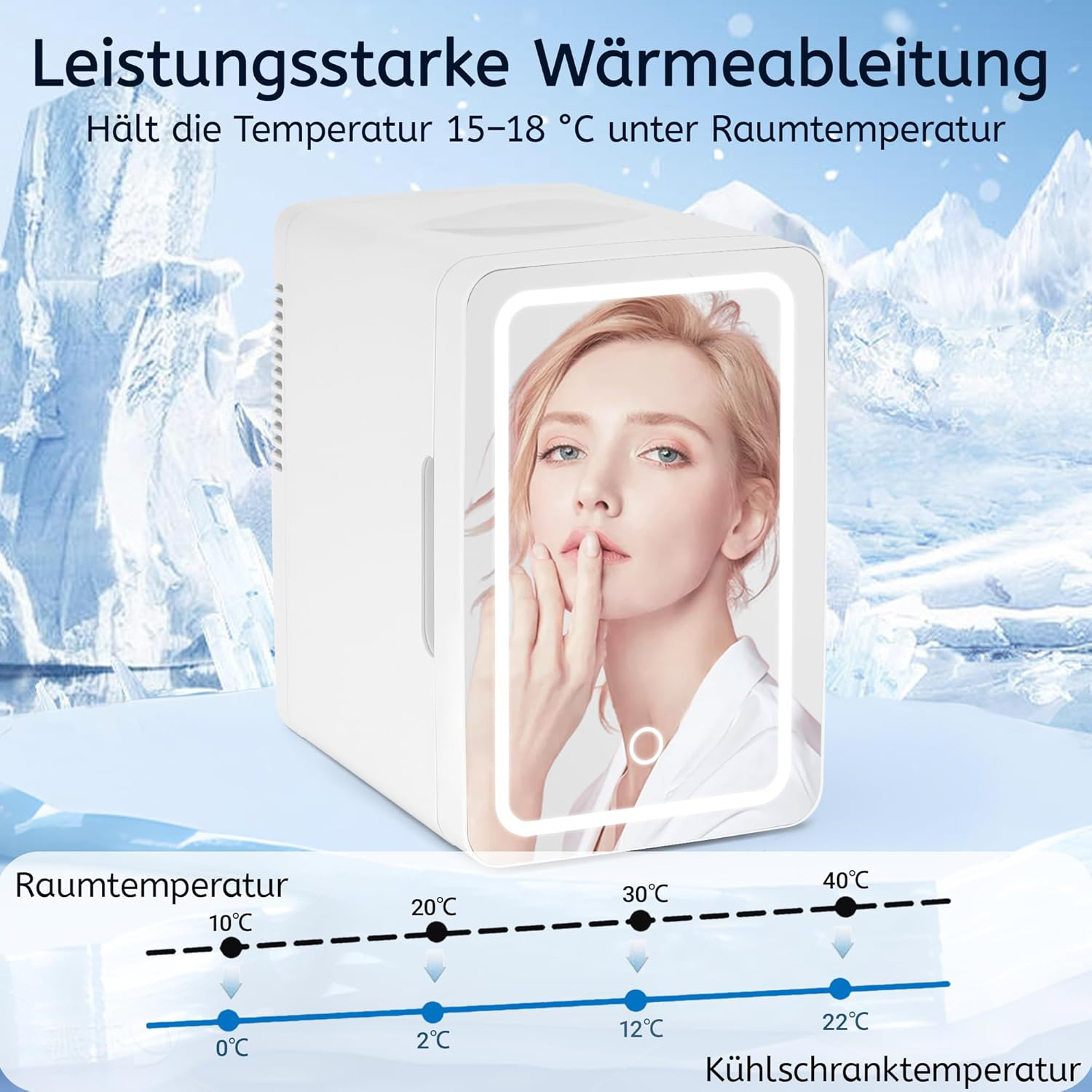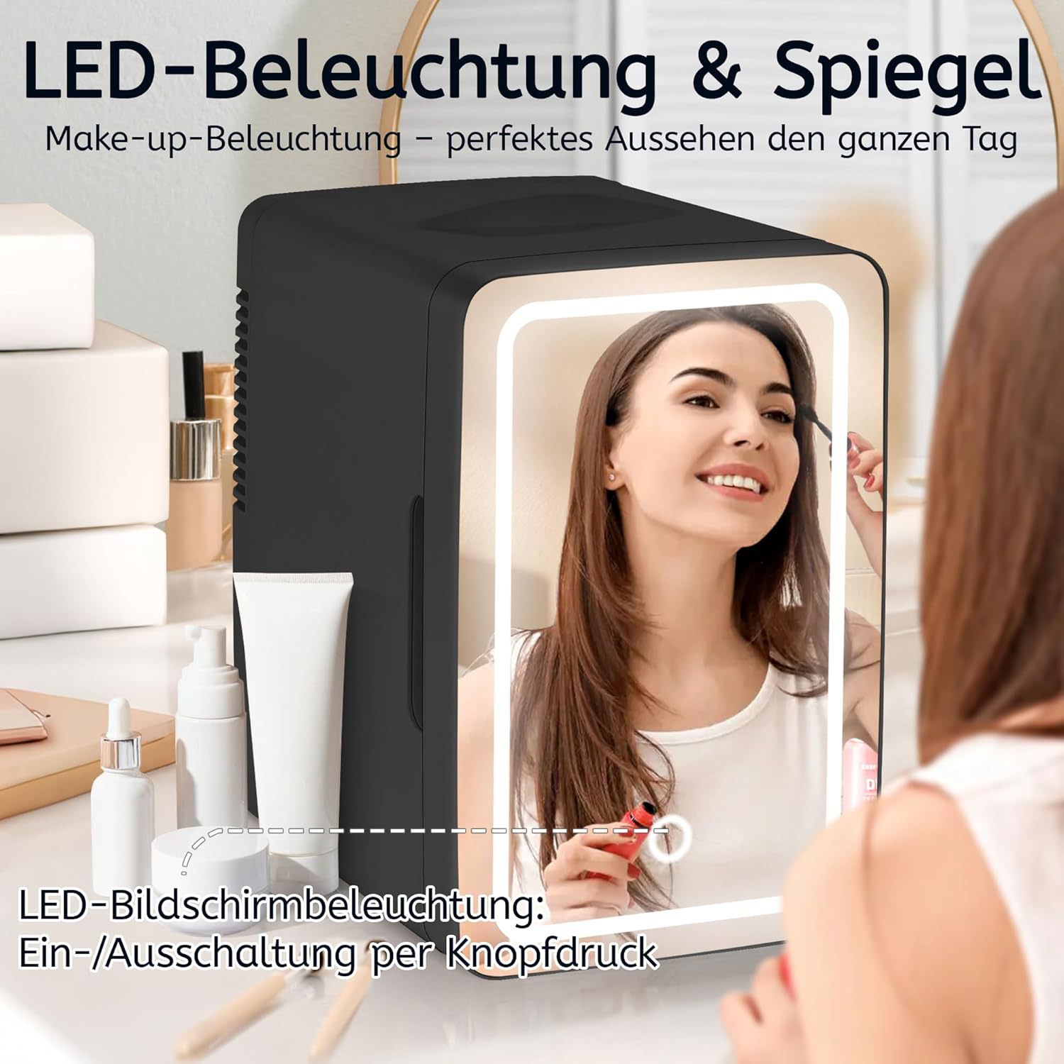 【LED-Beleuchtung & Spiegel】 Multifunktionaler Make-up-Kühlschrank mit Licht und Sicherheitsspiegel, der nur 2,3 kg wiegt Mini-Kühlschrank. Ob Sie Ihr tägliches Make-up perfektionieren oder eine nächtliche Hautpflege durchführen, der Spiegel sorgt für klares Licht.