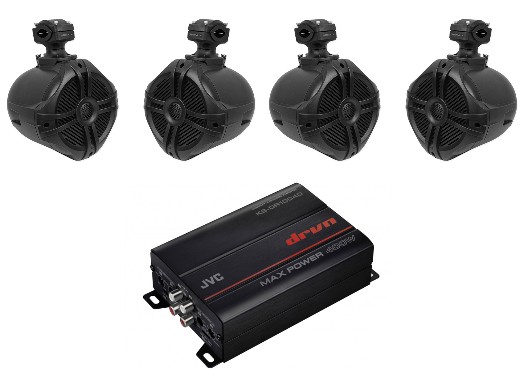 JVC KS-DR1004D 4-Channel Marine Amplifier+4) Black 6.5" Wakeboard Tower Speakers