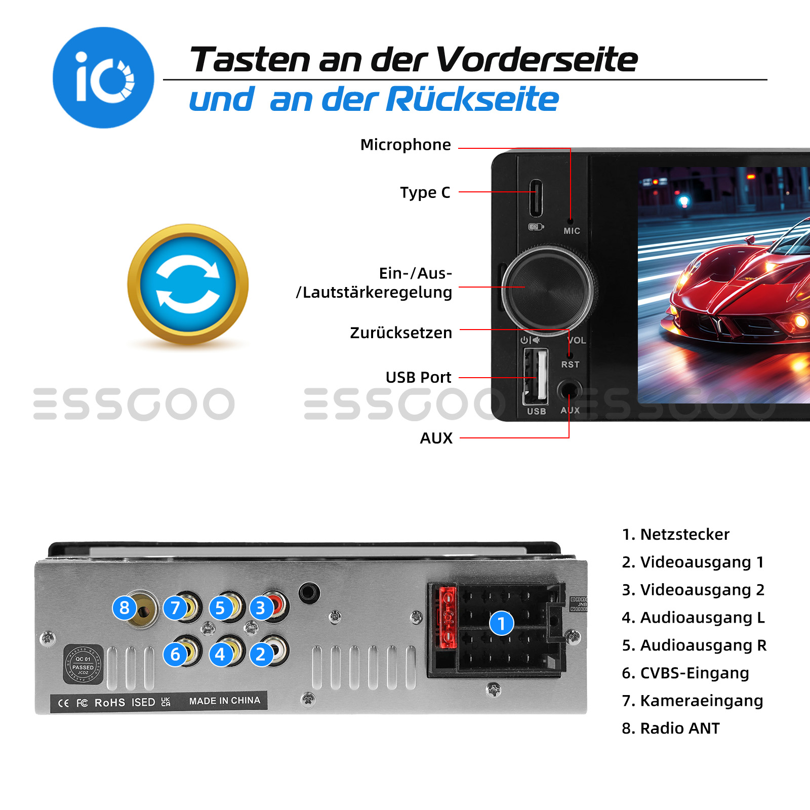 【Fahrzeugpassung und Multifunktionen】 Standardgröße, universelle Stromversorgung, Audiostecker, umfangreiche Funktionserweiterungsanschlüsse. Unser Single-DIN-Autoradio kann die Anforderungen der meisten Fahrzeuge erfüllen. Bitte bestätigen Sie vor der Bestellung, dass die Größe Ihrer Armaturenbrettöffnung geeignet ist. Zusätzliche Funktionen: USB/Typ-C, FM-Radio, Audio-/Video-Ausgang, Videoeingang für Front- und Rückfahrkamera. Arbeitsspannung: DC 12 V, maximale Ausgangsleistung: 4 x 60W.