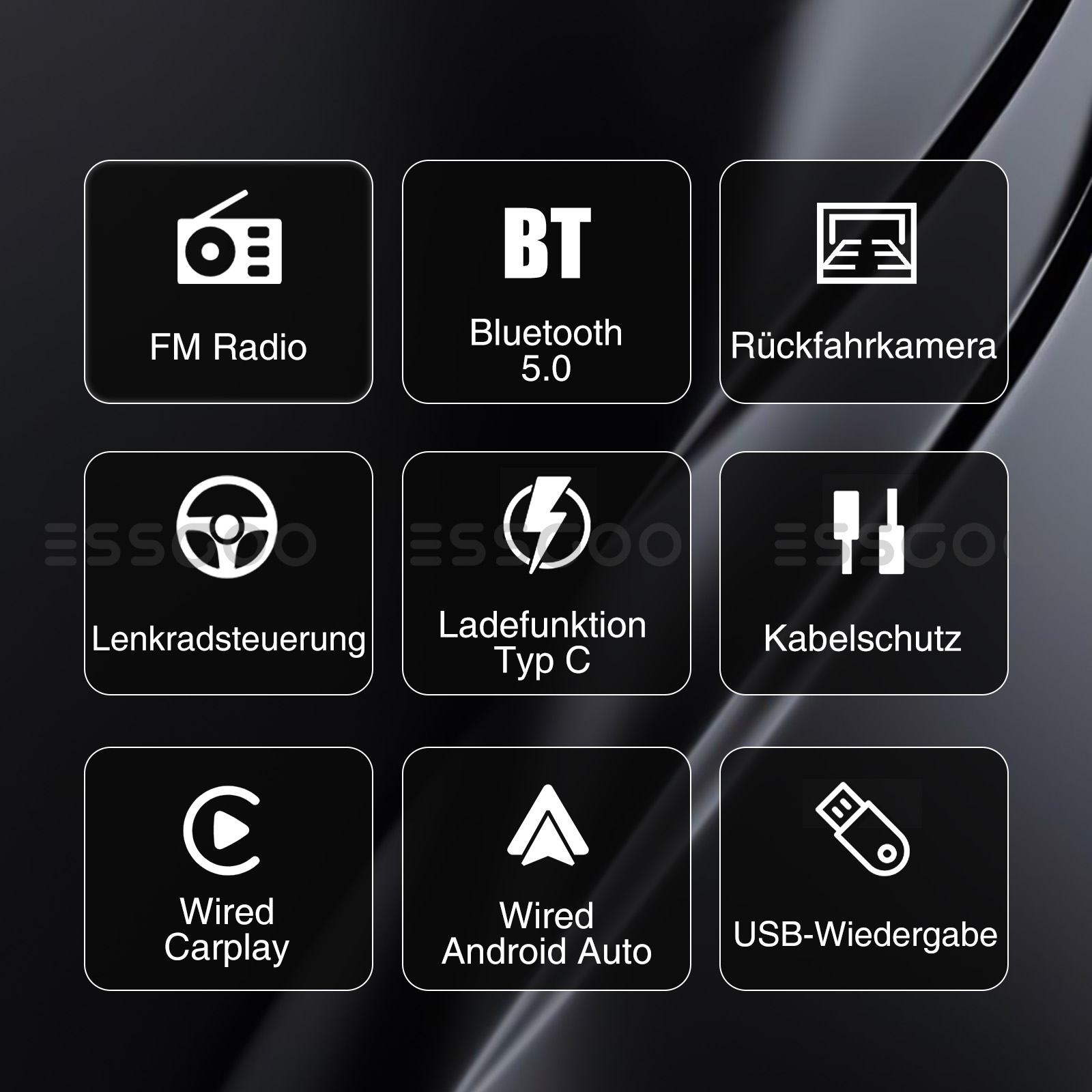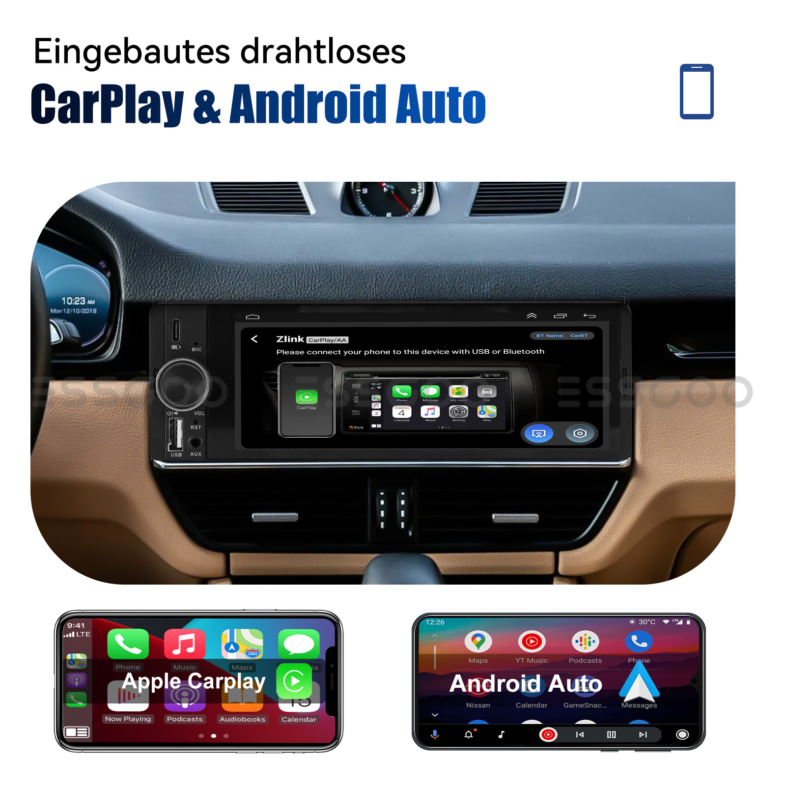 【Kabellos Apple Carplay & Android-Auto】 Tauchen Sie ein in ein nahtloses und benutzerfreundliches Infotainment-Erlebnis mit Apple CarPlay & Android Auto. Verbinden Sie Ihr iPhone mit Apple CarPlay oder Ihr Android-Smartphone mit Android Auto und greifen Sie sicher auf Anrufe, Textnachrichten, Navigation, Musik und vieles mehr zu. Mit intuitiver Bedienung über den Touchscreen haben Sie alle Funktionen bequem zur Hand, während Sie sicher am Steuer bleiben. Nutzen Sie Ihre bevorzugten Apps und bleiben Sie jederzeit verbunden, während Sie den Blick auf die Straße gerichtet haben. Machen Sie Ihr Fahrzeug zu einem erweiterten Hub für Ihre mobilen Geräte und erleben Sie eine neue Dimension des Infotainments.