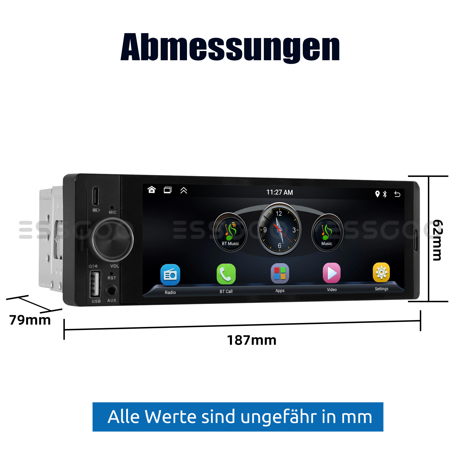 【6.36-Zoll-Doppel-Din-Touchscreen-Autoradio】 Kapazitiver 6.36-Zoll-1280x482-HD-Bildschirm. Universelle 1-DIN-Standardgröße 7,4 Zoll × 2,4 Zoll × 3,1Zoll, passend für die meisten Fahrzeuge. Unsere Single-Din-Stereoanlage ist mit einem kapazitiven 6.36-Zoll-HD-Touchscreen ausgestattet und macht sie empfindlicher und genauer.