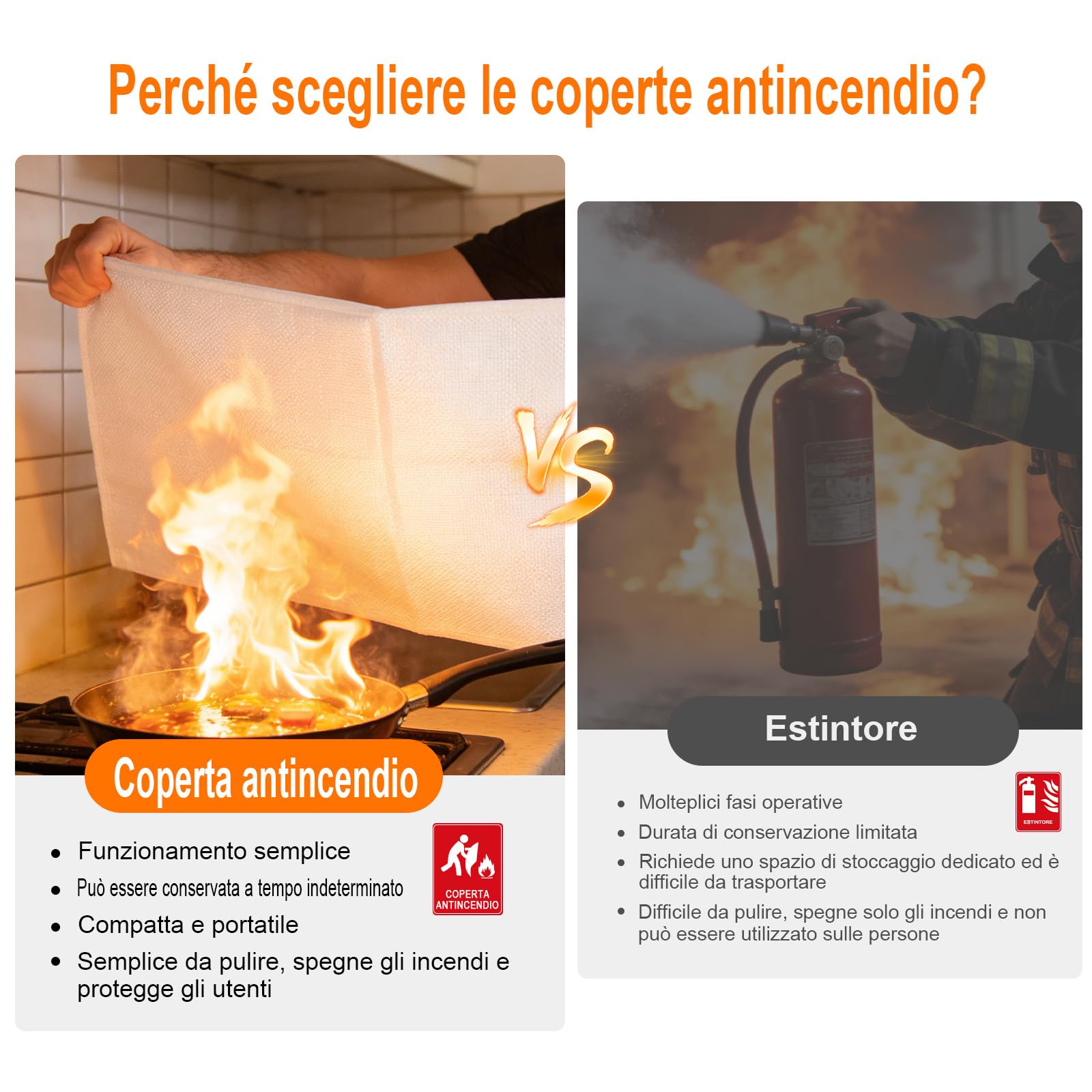 Coperte antincendio offrono una doppia protezione: possono essere avvolte intorno al corpo per prevenire ustioni da fiamme o drappeggiate direttamente sulla fonte dell'incendio per arrestarne immediatamente la propagazione. Rispetto agli estintori a polvere, le coperte antincendio sono più comode da usare, più facili da trasportare e conservare e non lasciano residui come la polvere estinguente.