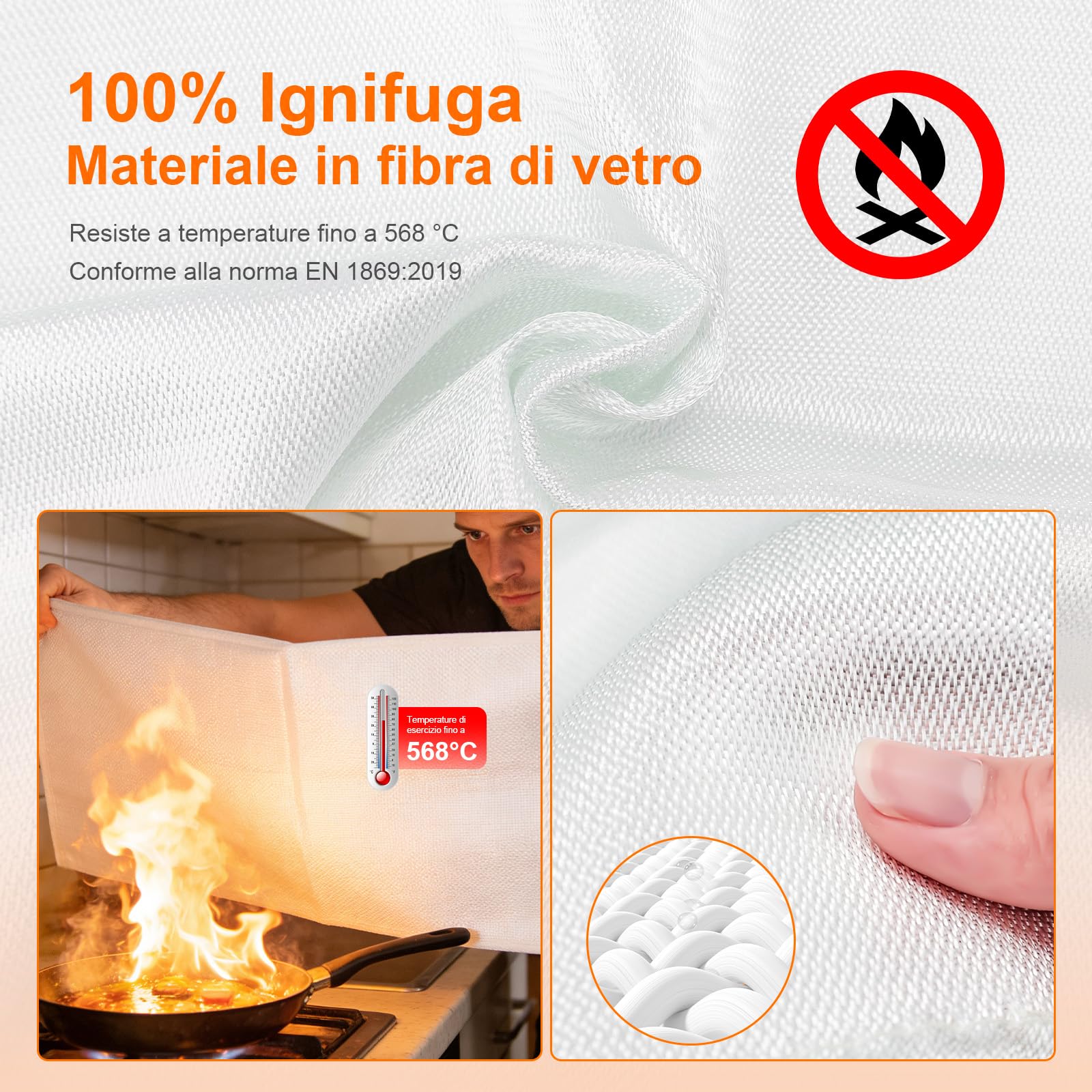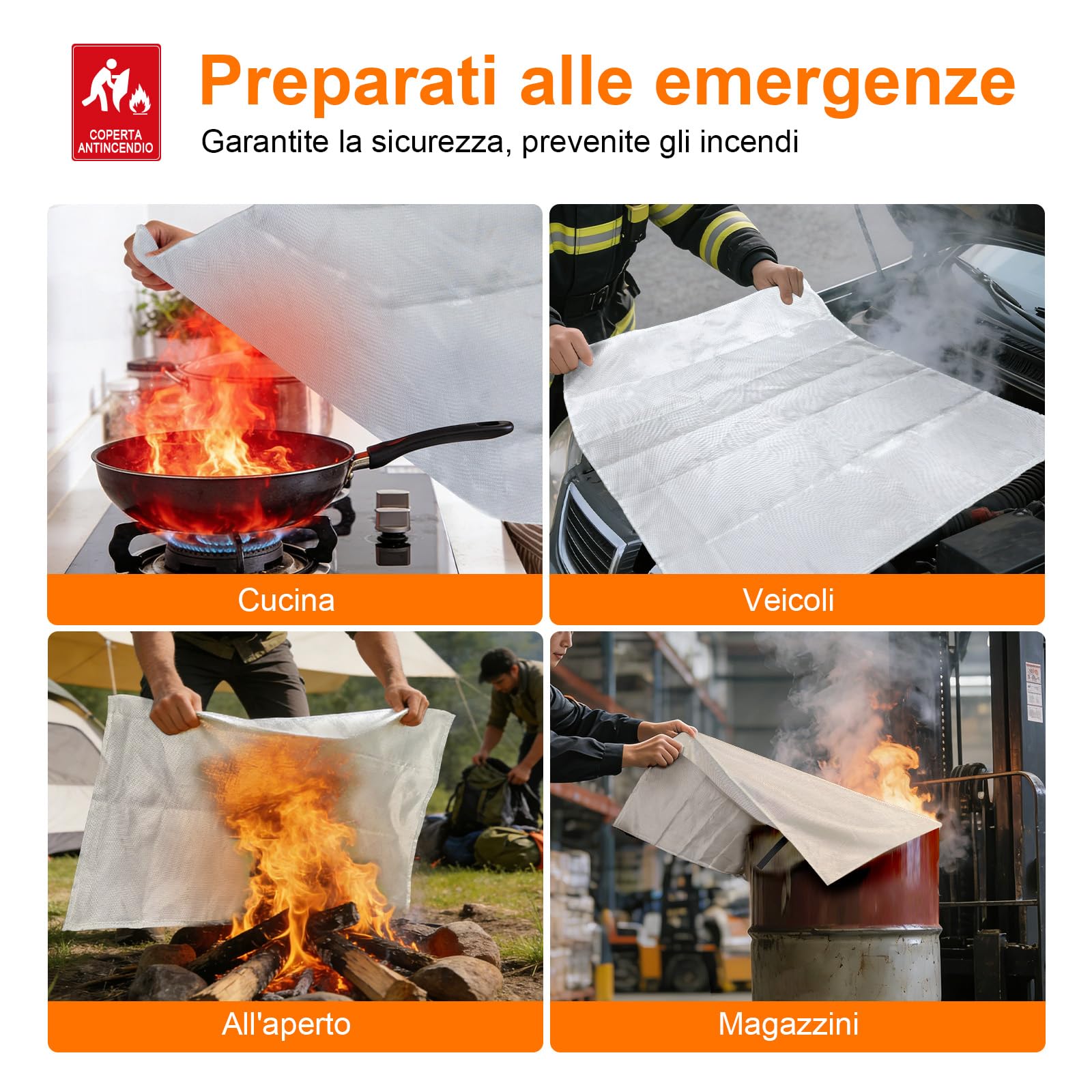 Coperta antincendio in fibra di vetro certificata EN 1869:2019 adatta per incendi causati da olio da cucina (Classe F). Resiste a temperature fino a 568 °C, ideale per cucine, abitazioni, veicoli, campeggio e barbecue. È sufficiente coprire le fiamme per interrompere l'apporto di ossigeno. Solo per incendi di lieve entità: in caso di incendio grave, chiamare immediatamente i servizi di emergenza.