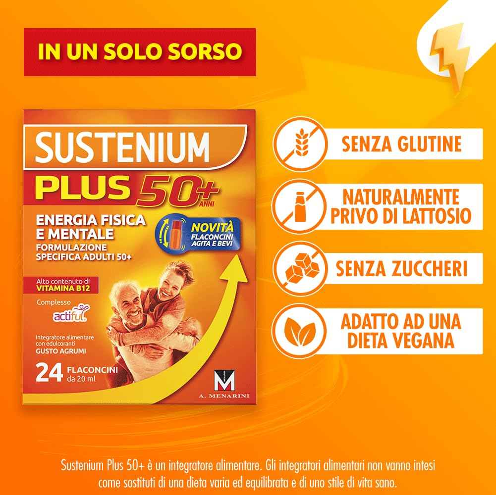 Gli impegni e le passioni sono tanti, e per seguirli al meglio vogliamo sentirci energici e vitali. Con il passare degli anni però, può capitare di stancarsi più facilmente e di ritrovarsi con meno energia proprio quando ne sentiamo più bisogno. Sustenium Plus 50+ è un integratore alimentare energizzante con una formulazione specifica per adulti 50+ in pratici flaconcini, da assumere quando e dove vuoi. Dai energia alla tua energia! AVVERTENZE: Non superare la dose giornaliera consigliata. Tenere fuori dalla portata dei bambini al di sotto dei 3 anni d’età. Gli integratori alimentari non vanno intesi come sostituti di una dieta varia ed equilibrata e di uno stile di vita sano. Un consumo eccessivo può avere effetti lassativi.