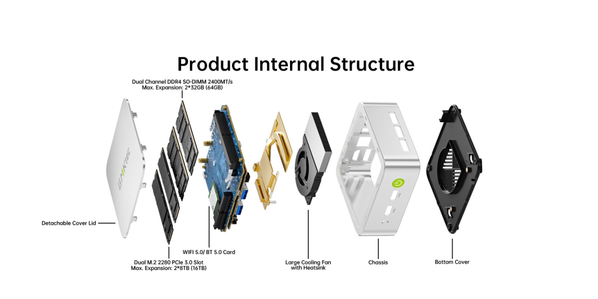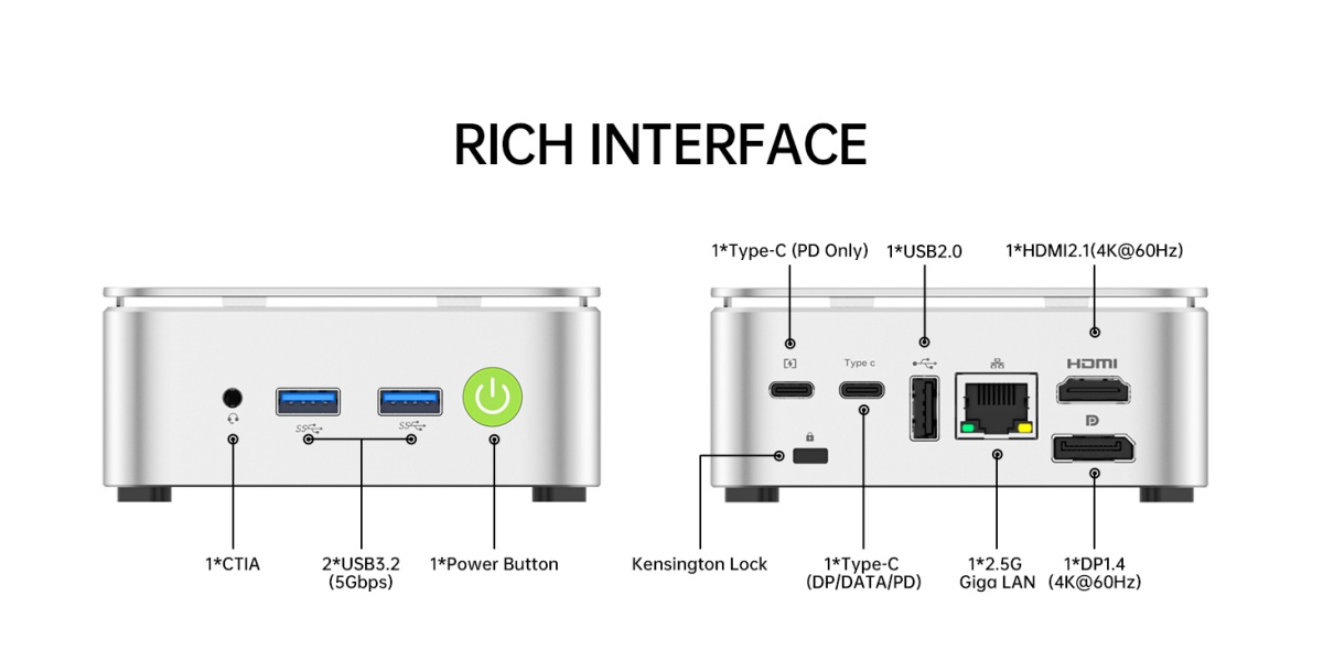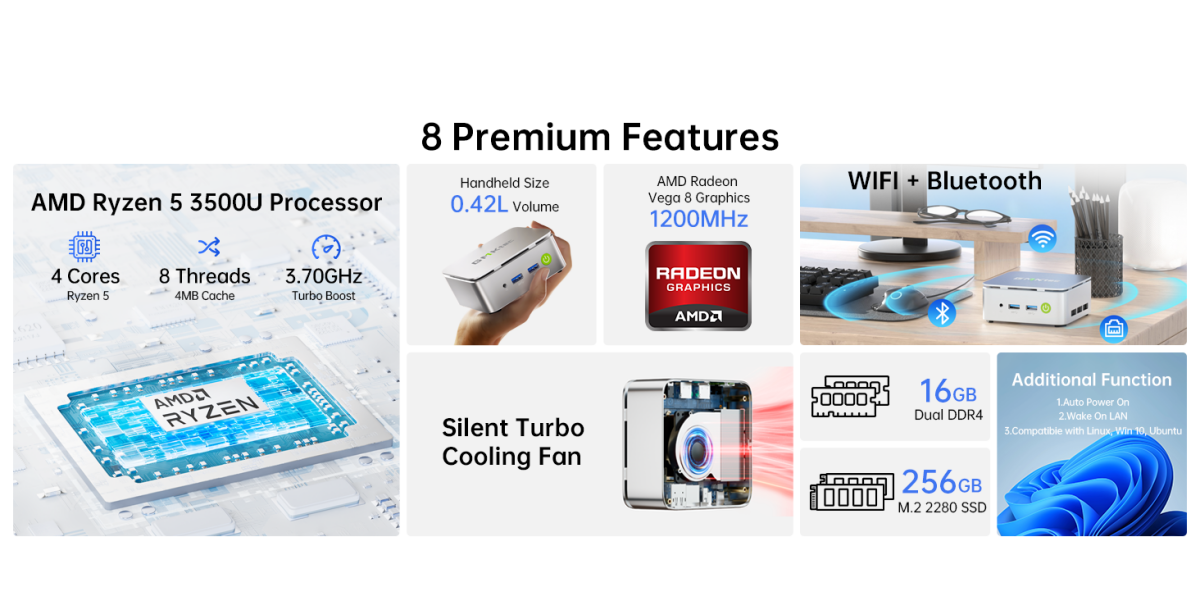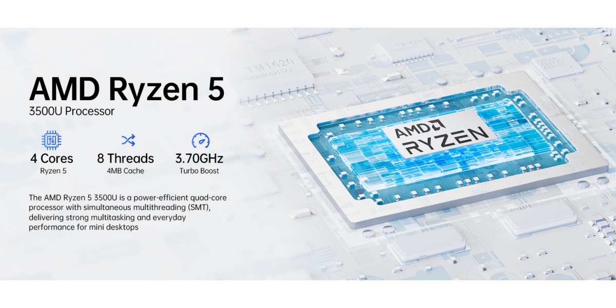 | CPU | AMD Ryzen 5 3500U (4C/8T, 4M Cache,up to 3.7GHz) | lnterface | 1 x USB-C Power Port; 2 x USB 3.2 Ports; 1 x USB 2.0 Ports;1 x Type-C Ports; 1 x HDMI Ports; 1 x DisplayPort; 1 x RJ45 Ethernet LAN Port 2.5Gbps; 1 x 3.5mm CTIA Port |