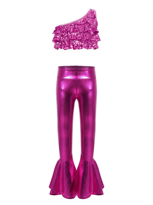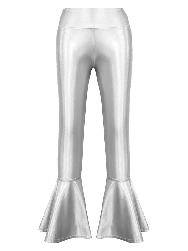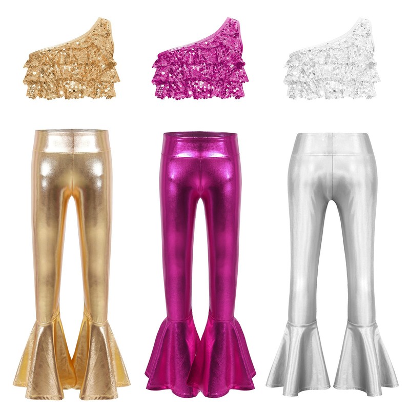 The bell-bottom metallic pants are a stylish addition, making the whole outfit suitable for various dance events, stage shows, or even themed parties.