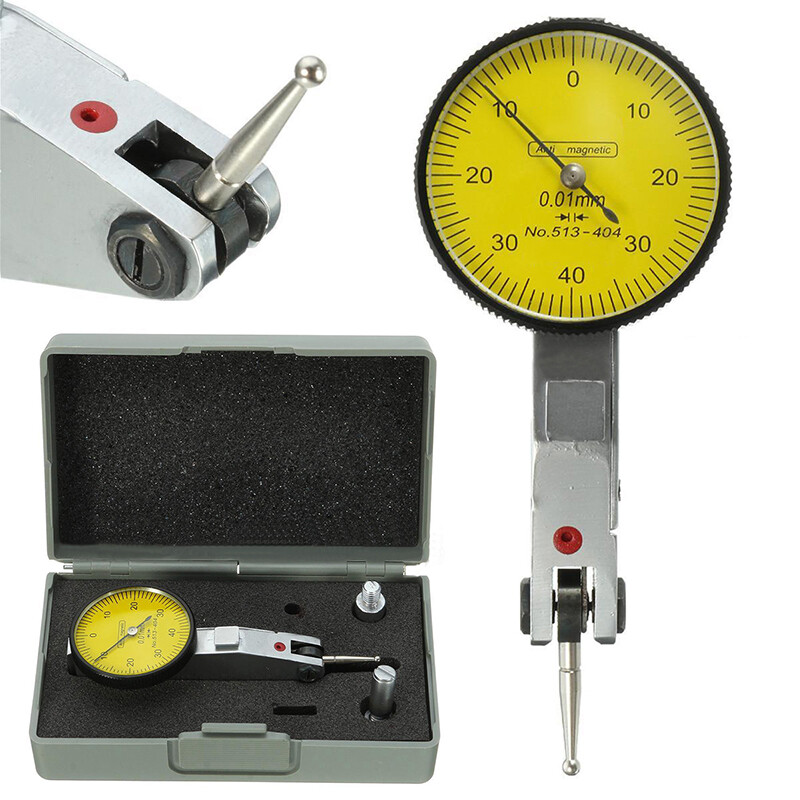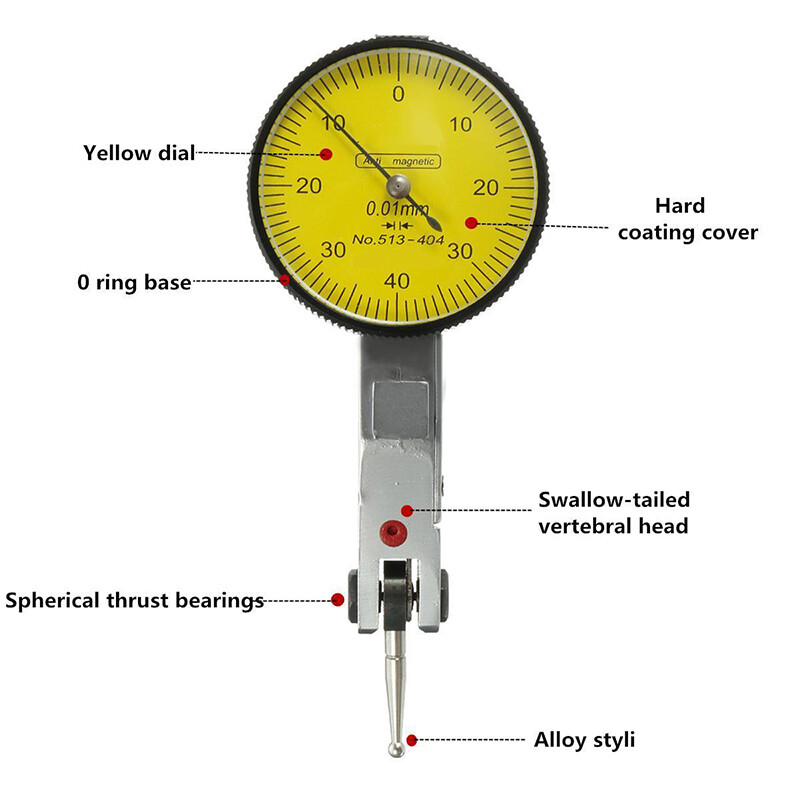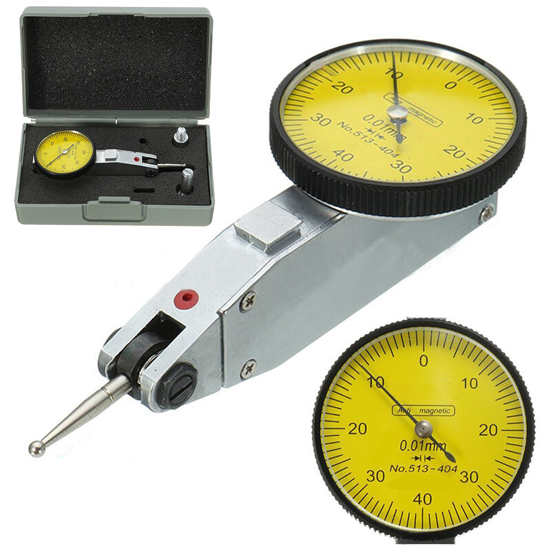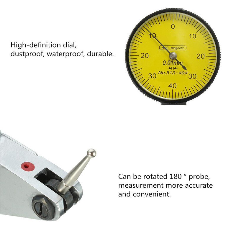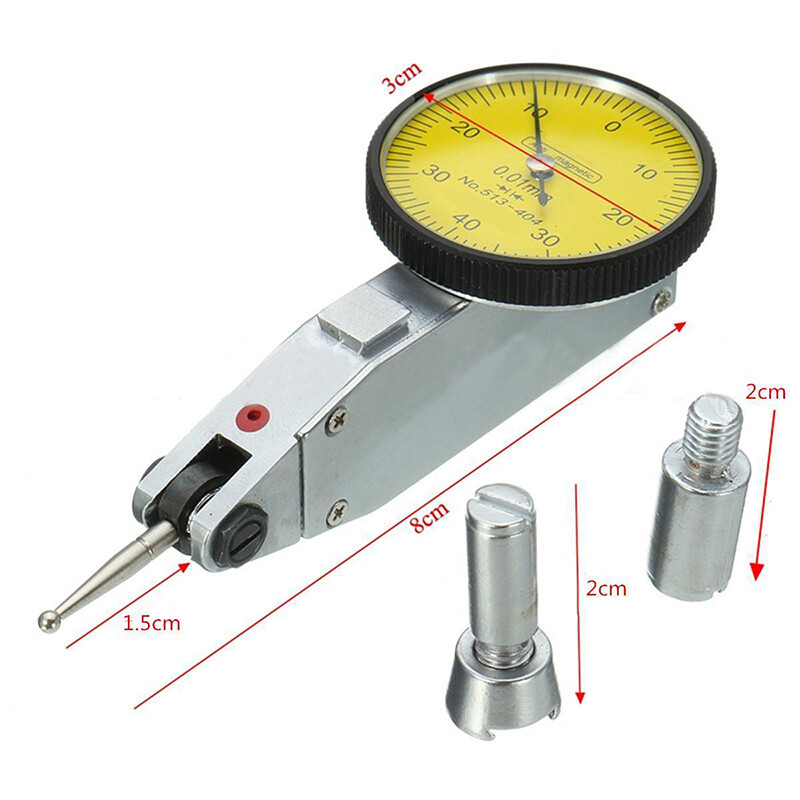 Dieser Messuhr Test dient zur Messung während der Bearbeitung, Layout und Inspektionsarbeiten. Das Zifferblatt hat eine feine schwarze Skala von 0-40-0 Zoll lesen ausgeglichen und eine rote Skala von 0,001 mm ausgeglichen Messwert.
