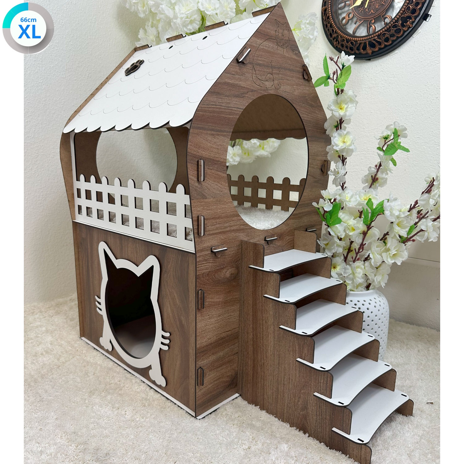 Verwandeln Sie Ihr Zuhause in ein Paradies für Ihre Katze mit diesem liebevoll gestalteten Katzenhaus in Braun & Weiß. Das elegante Design mit verspielten Details wie einem Katzenschnittfenster, einer Treppe und einem umzäunten Balkon bietet nicht nur Funktionalität, sondern auch Stil. Erhältlich in den Größen XL, XXL und 3XL, passt sich dieses Katzenhaus perfekt an jede Wohnfläche und Katzengröße an.