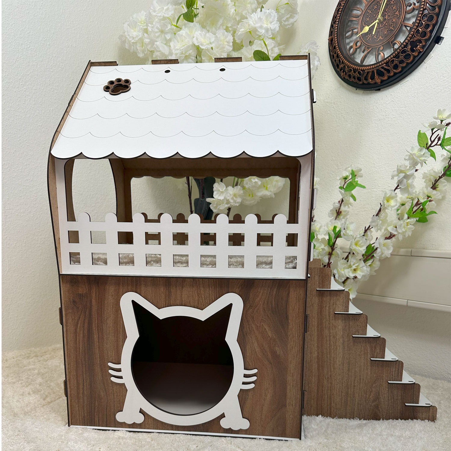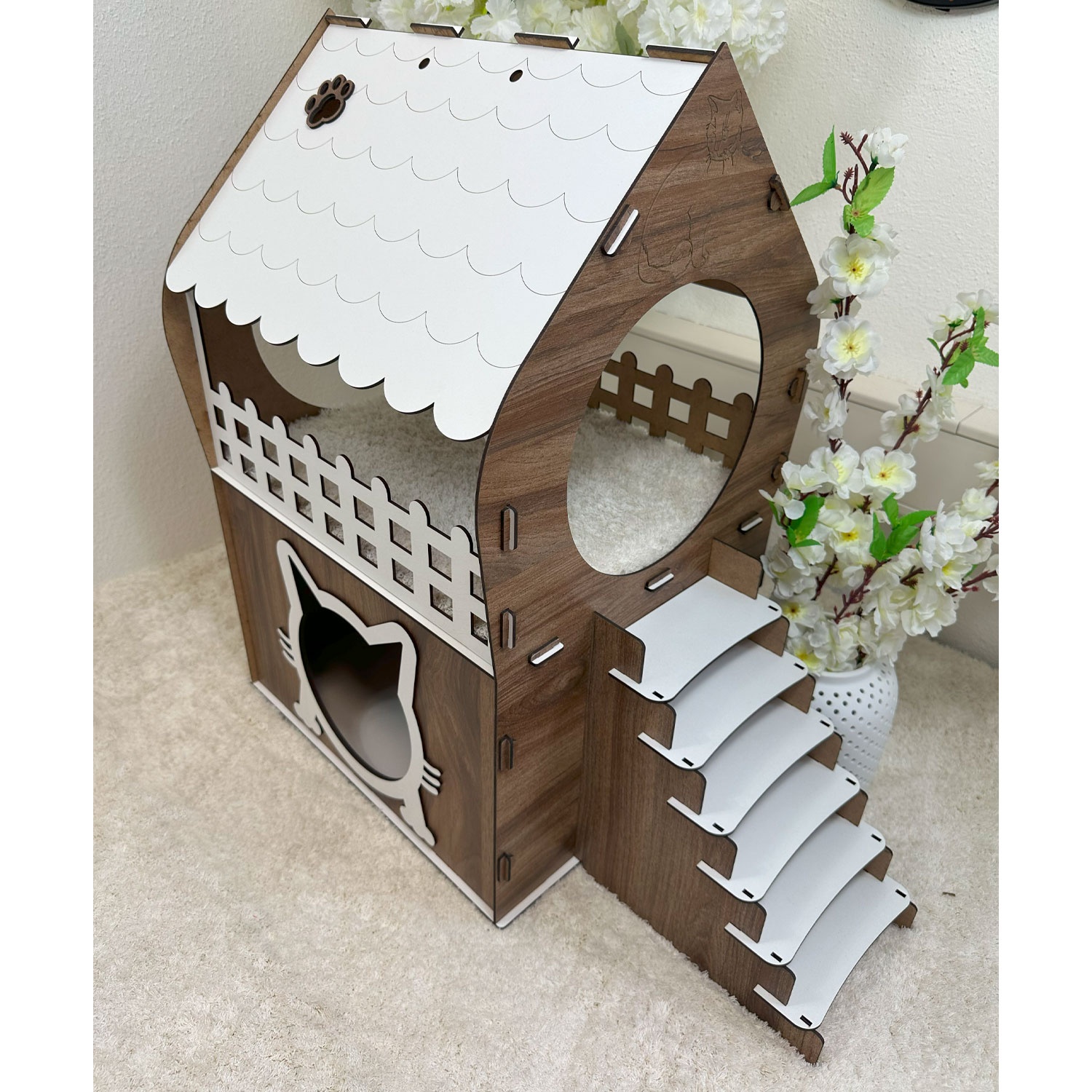 Das Katzenhaus in Braun & Weiß ist mehr als nur ein Rückzugsort – es ist ein stilvolles Möbelstück für Ihr Zuhause. Die Kombination aus natürlicher Holzoptik und klaren weißen Akzenten bringt Wärme und Eleganz in jeden Raum. Ihre Katze wird es genießen, sich in diesem liebevoll gestalteten Haus zu entspannen, zu spielen oder das Geschehen von oben zu beobachten.