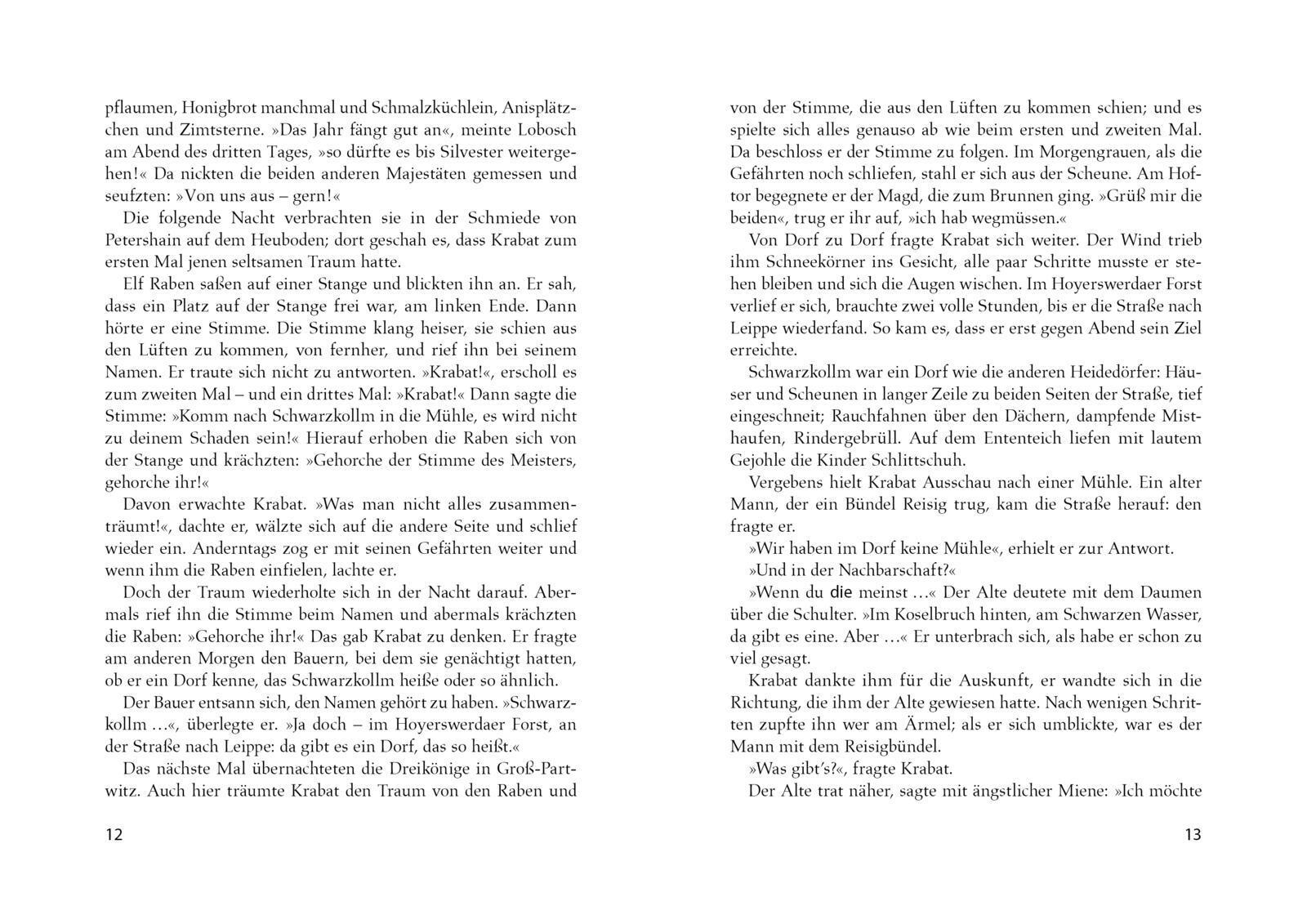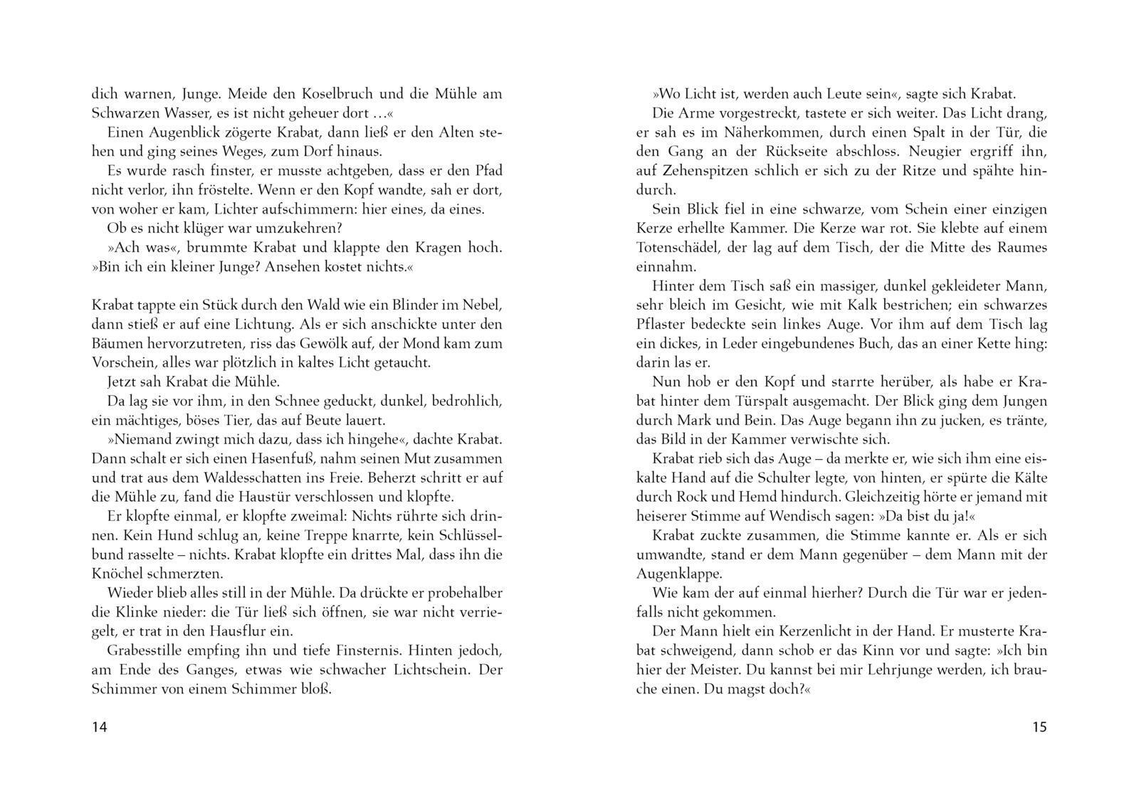 Dem 14-jährigen Krabat erscheinen in einer Winternacht elf Raben in seinen Träumen. Er kann ihrem Ruf nicht widerstehen und macht sich auf den Weg zur gefürchteten Mühle am Koselbruch. Dort angekommen verspricht ihm der unheimliche Müllermeister ein leichtes und schönes Leben - zu einem hohen Preis. Doch wie kann die Verstrickung mit dem Bösen beendet werden, wie der Meister besiegt werden Nur eines hat diese Macht: Die bedingungslose Liebe eines Mädchens.